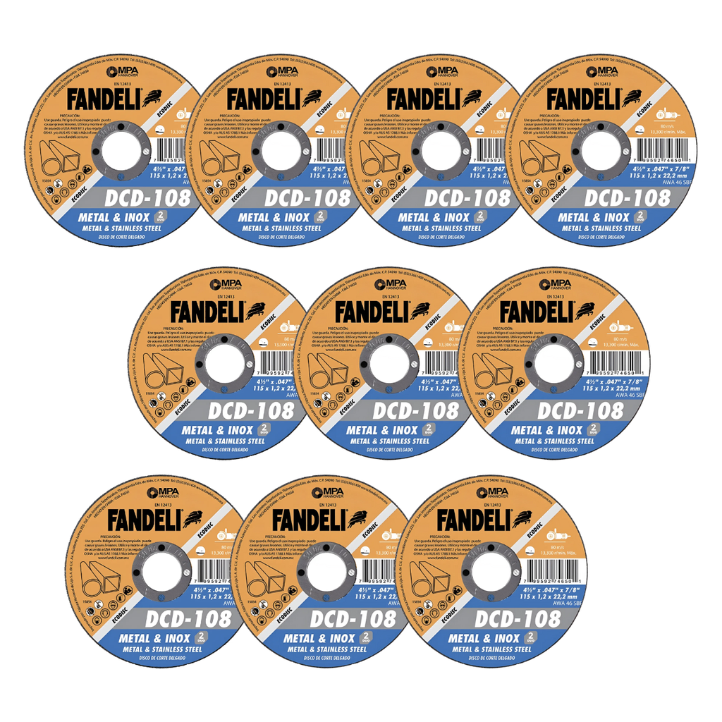 10 piezas Disco Corte Fandeli Eco 4½" Metal Inoxidable 115mm x 1.2mm x 22.2mm Modelo 74650