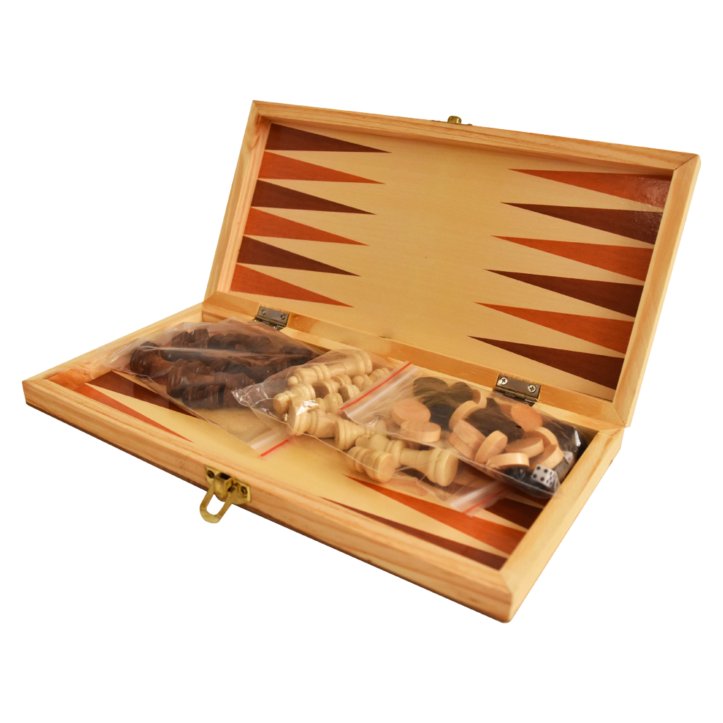 Ajedrez, Damas Inglesas y Backgammon en uno solo. Todas las fichas se pueden guardar en el tablero de madera que también se dobla. Favorece el desarrollo de las aptitudes mentales tales como: elevar el C.I., ayudar a prevenir el Alzheimer, ejercitar ambos hemisferios cerebrales, mejorar la creatividad, ayudar a la memoria, facilitar la concentración, entre otras