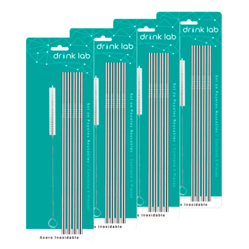 4 Sets de 4 Popotes Reusables de Acero Inoxidable Rectos Ergonómico Drink Lab