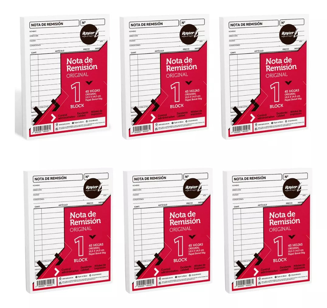 6 Block Nota Remisión 1/4 Rayter 45 Hojas C/u Original 56g