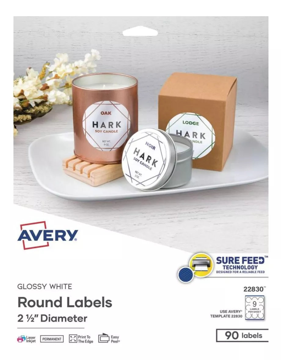 Las etiquetas Avery redondas te ayudan a personalizar tu marca, son ideales para organizar, identificar y decorar mesas de dulces; etiquetar productos y mucho más. Cuentan con adhesivo permanente y son imprimirse hasta el borde, su acabado brillante te permite aplicar colores y formas hasta el límite, personaliza tus etiquetas redondas para el producto que tengas en mente, ideales para emprendimientos. Coloca sobre vidrio, papel, plástico, madera, metal y más.
