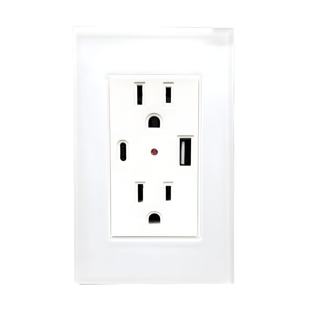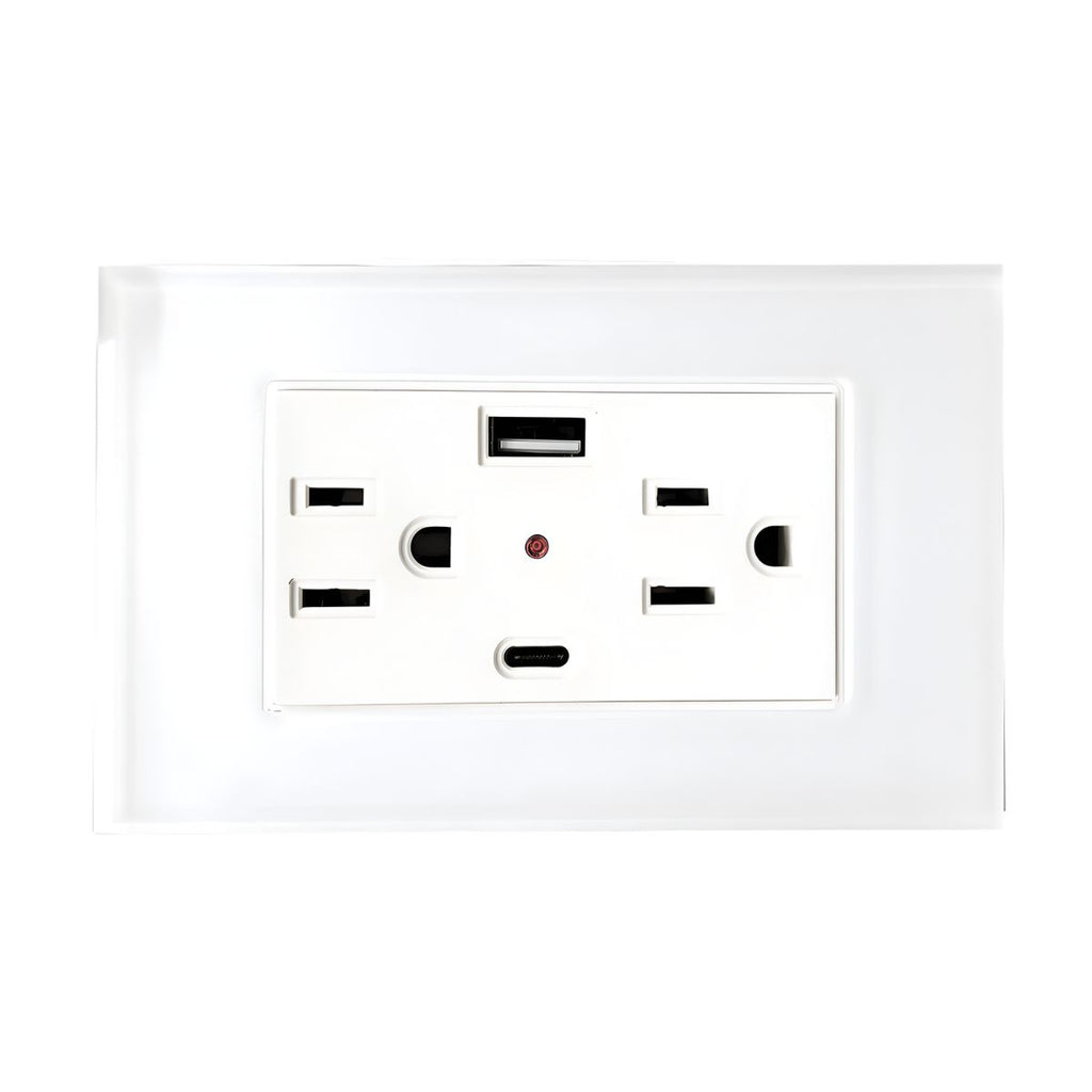 Contacto doble aterrizado diseñado para uso interior, que integra entradas USB tipo A y tipo C para carga directa de dispositivos sin necesidad de adaptadores. Su cuerpo de una sola pieza fabricado en policarbonato y su placa de acrílico blanca ofrecen un diseño moderno, resistente y funcional, ideal para espacios residenciales y comerciales.