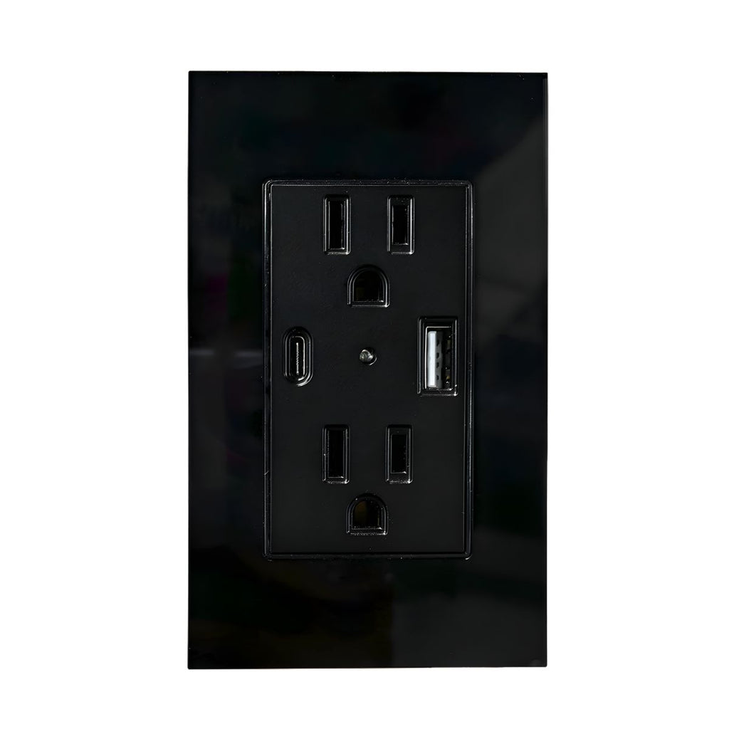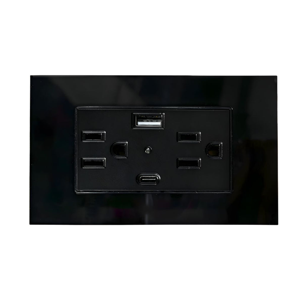 Contacto doble aterrizado para uso interior que integra entradas USB tipo A y tipo C, permitiendo la carga directa de dispositivos electrónicos sin necesidad de adaptadores adicionales. Su diseño moderno con cuerpo de policarbonato y placa de acrílico negra brinda resistencia, seguridad y una excelente estética para instalaciones residenciales y comerciales.