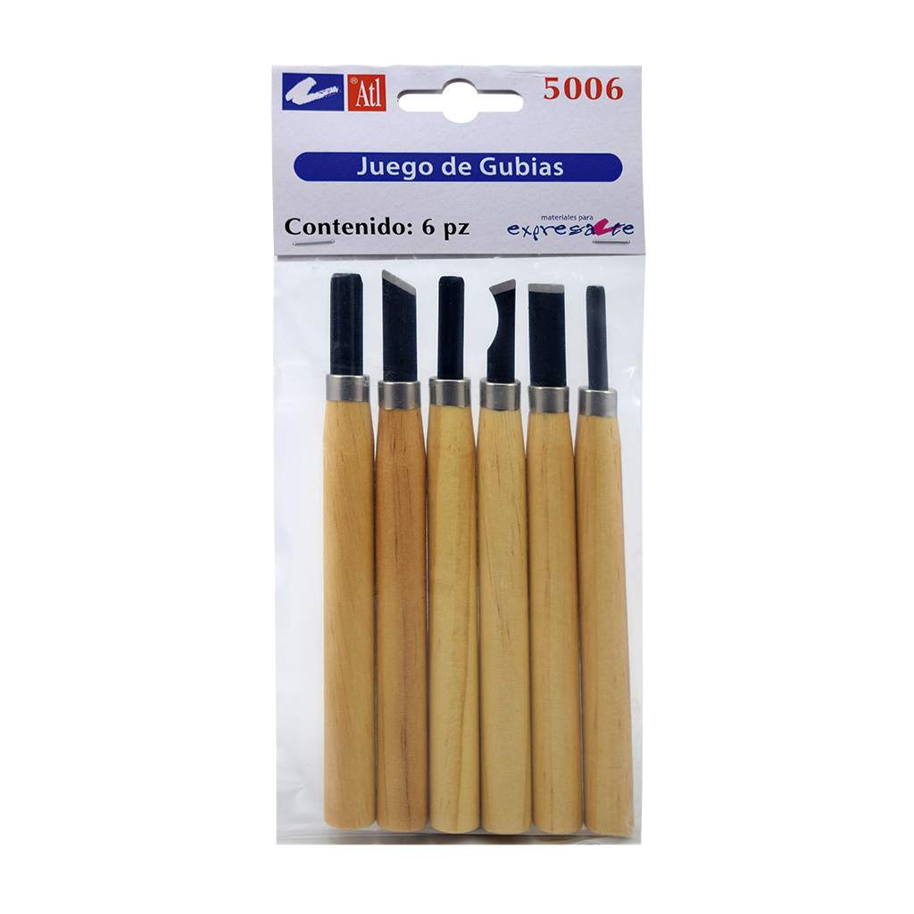 Gubias con puntas de diferentes formas, mango de madera. Especiales para grabar en linóleo y madera muy suave
