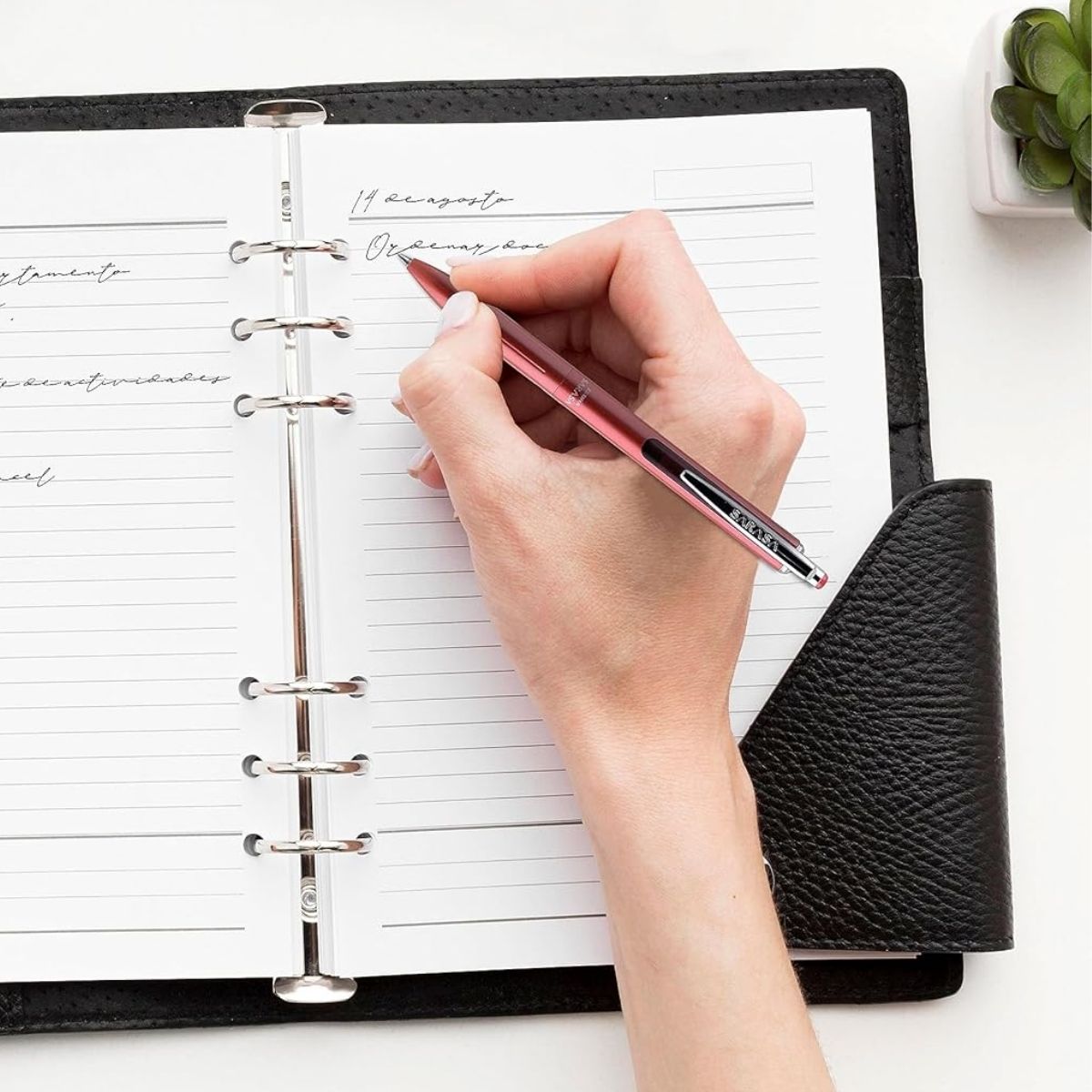 Este rollerball metálico, con su acabado en color rosa, ofrece una experiencia de escritura superior gracias a su punto mediano que desliza suavemente sobre el papel, dejando una línea de tinta negra a base de aceite, perfecta para aquellos que valoran la claridad y la fluidez.