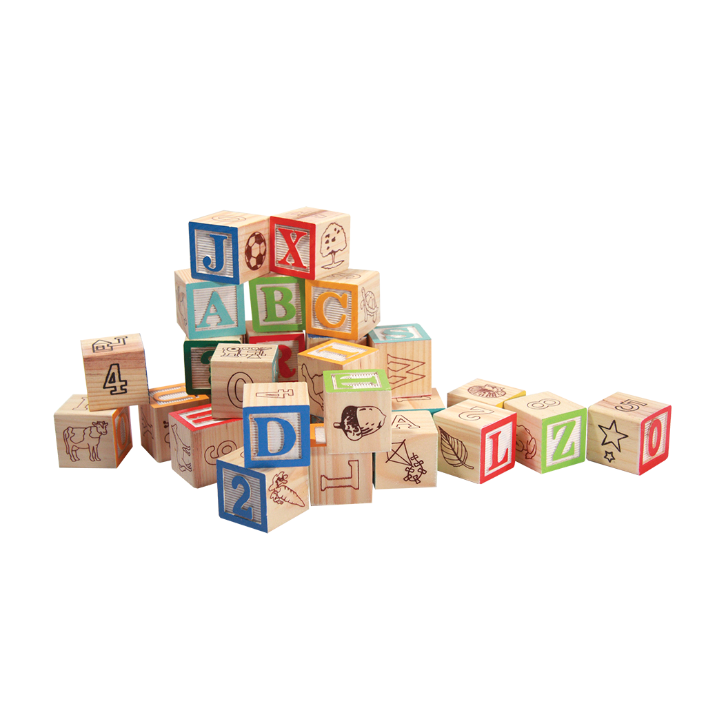 Cubos de madera con letras, números y diferentes ilustraciones. Diseñados para apilar y derribar formando torres altas. También ayudan al aprendizaje de sumas y restas simples, así como a reconocer letras para aprender a leer y escribir, o asociar la imagen de algún objeto con la letra correspondiente, fortaleciendo así el vocabulario. Estimulan la parte sensorial al tocar sus caras con relieves. Apoyan en el desarrollo de las habilidades matemáticas y de lenguaje, así como la psicomotricidad fina y la imaginación.
