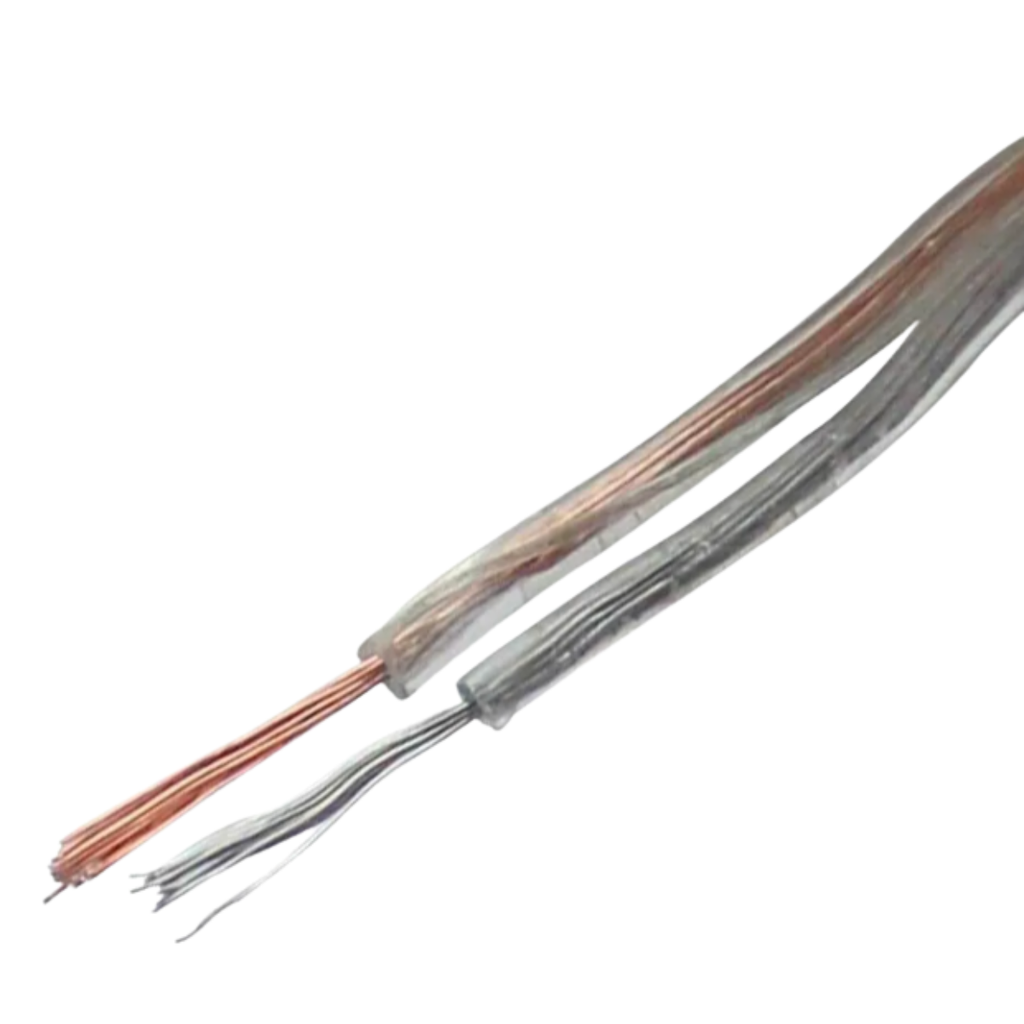 Este cable está diseñado para conexión de bocinas o altavoces, ideal para sistemas de audio domésticos o de entretenimiento. Es un cable dúplex polarizado con recubrimiento transparente, lo que permite ver los conductores internos y facilita la correcta identificación de polaridad (positivo / negativo). Se vende típicamente en rollo de 100 metros