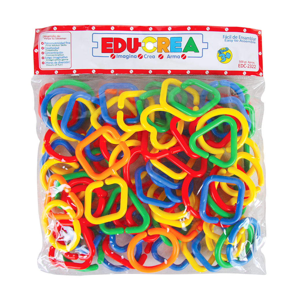 Juego de ensamble con piezas de plástico que se unen entre sí para formar cadenas.