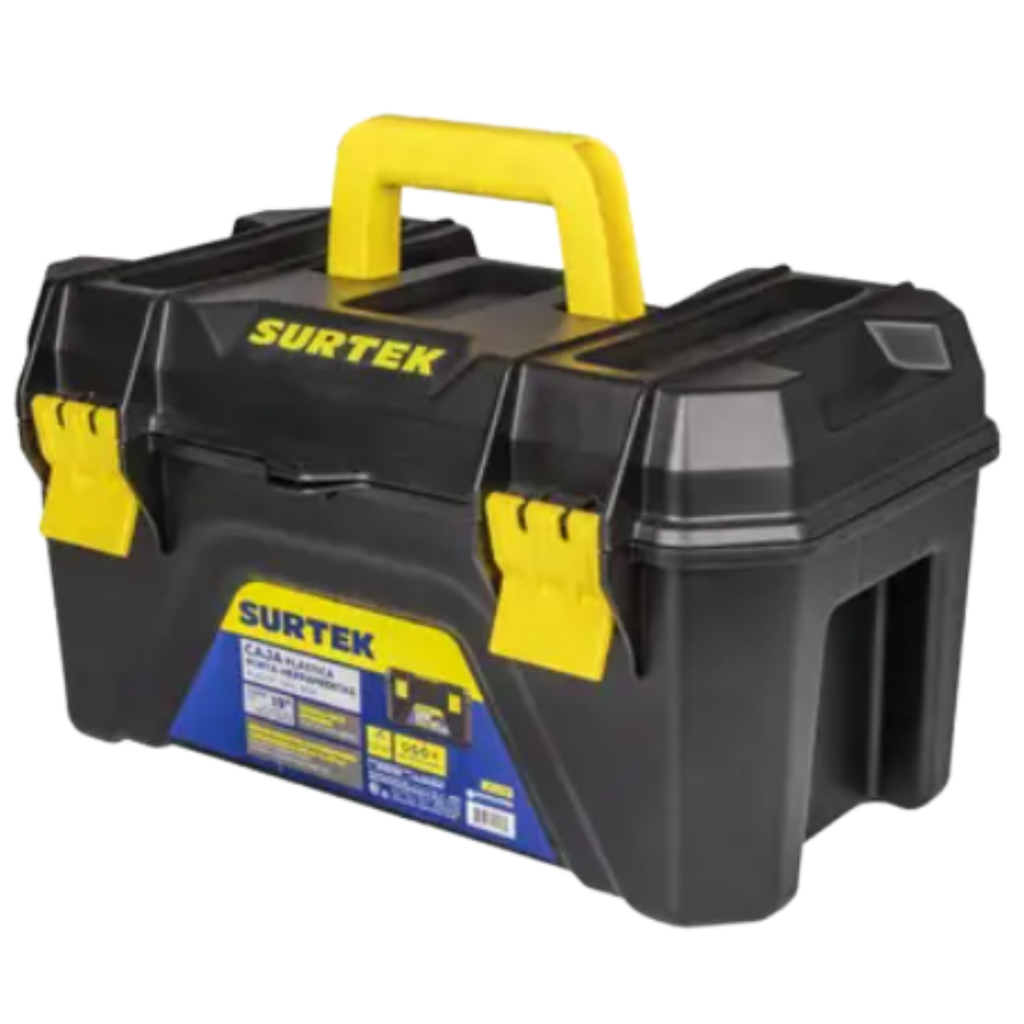 Caja para herramientas fabricada en plástico resistente, diseñada para almacenar y organizar herramientas, accesorios y piezas pequeñas. Incluye una charola interna con divisiones que facilita separar tornillos, brocas y otros elementos. Los broches plásticos aseguran la tapa y su diseño ligero permite transportarla con facilidad. Es ideal para uso doméstico, talleres o pequeños trabajos de mantenimiento. Color negro.