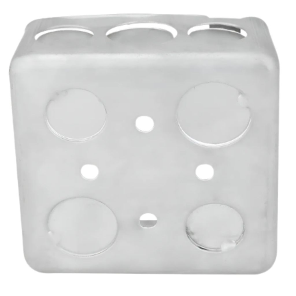 • Su espesor de lámina es de 0.76 mm. Esto equivale a un formato cuadrado de 4″ × 4″ pulgadas, con lo que puede alojar conexiones, empalmes, tomacorrientes o interruptores de tamaño estándar en instalaciones residenciales o comerciales.