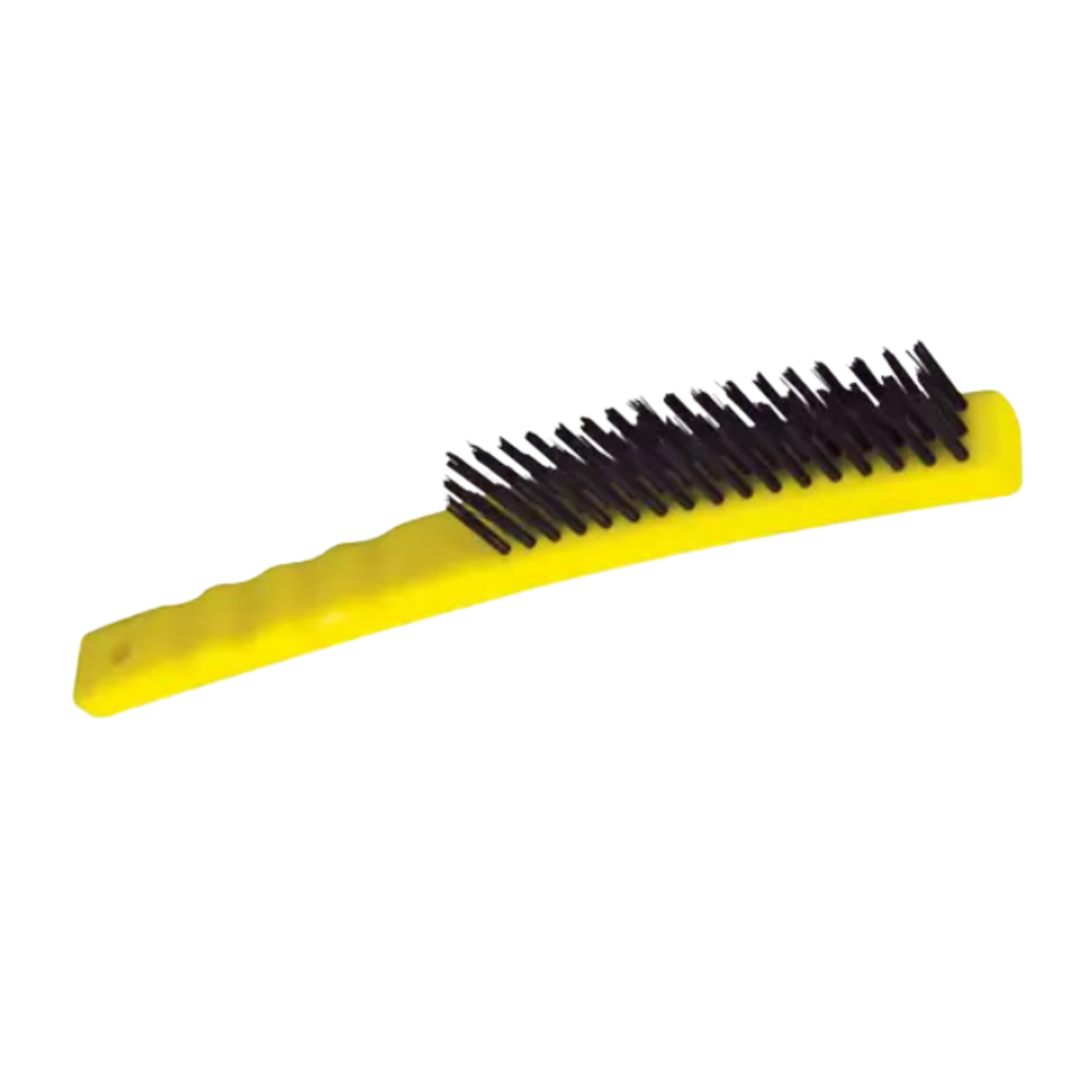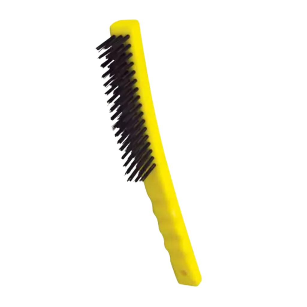 El cepillo de alambre de acero al alto carbono con 3×17 filas de pinceles y mango es una herramienta manual diseñada para limpiar y preparar superficies metálicas. Se utiliza para eliminar óxido, pintura vieja, residuos de soldadura y suciedad, dejando la superficie lista para trabajos de acabado o pintura. Su configuración de 3 filas por 17 hileras de cerdas permite una limpieza efectiva y uniforme.