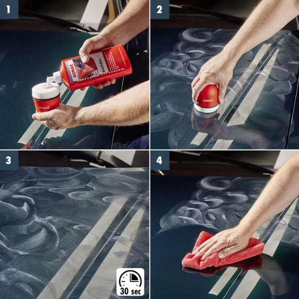 Sonax Easy Shine es una cera líquida abrillantadora con carnauba natural, diseñada para restaurar el color y el brillo de la pintura automotriz. Elimina ligeros raspones, protege contra agentes externos y deja un acabado duradero. Su fórmula permite una aplicación fácil incluso bajo el sol o sobre lámina caliente, ideal para mantenimiento rápido y detallado exterior.