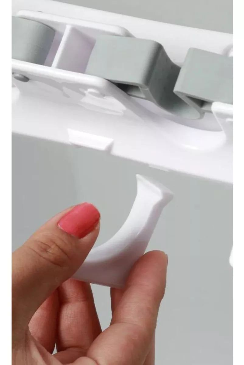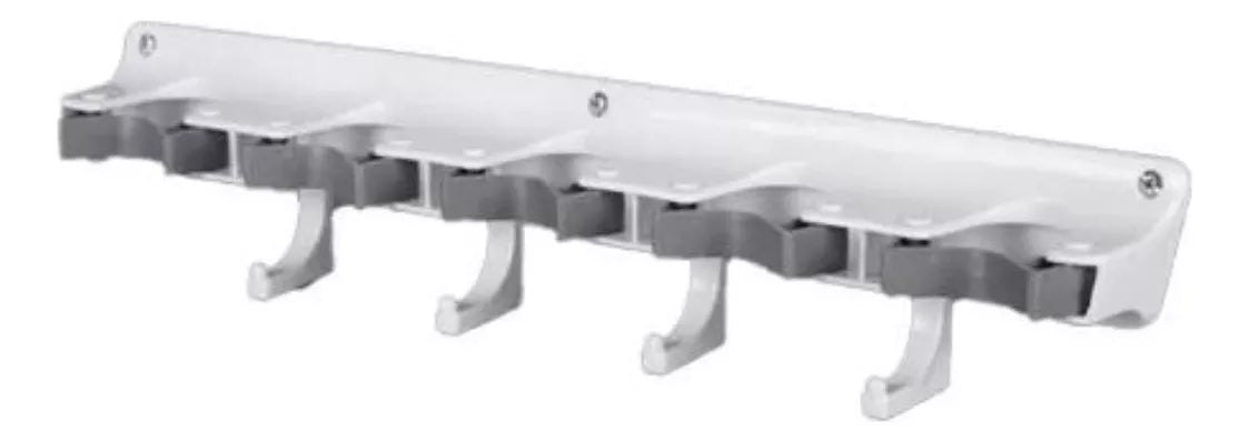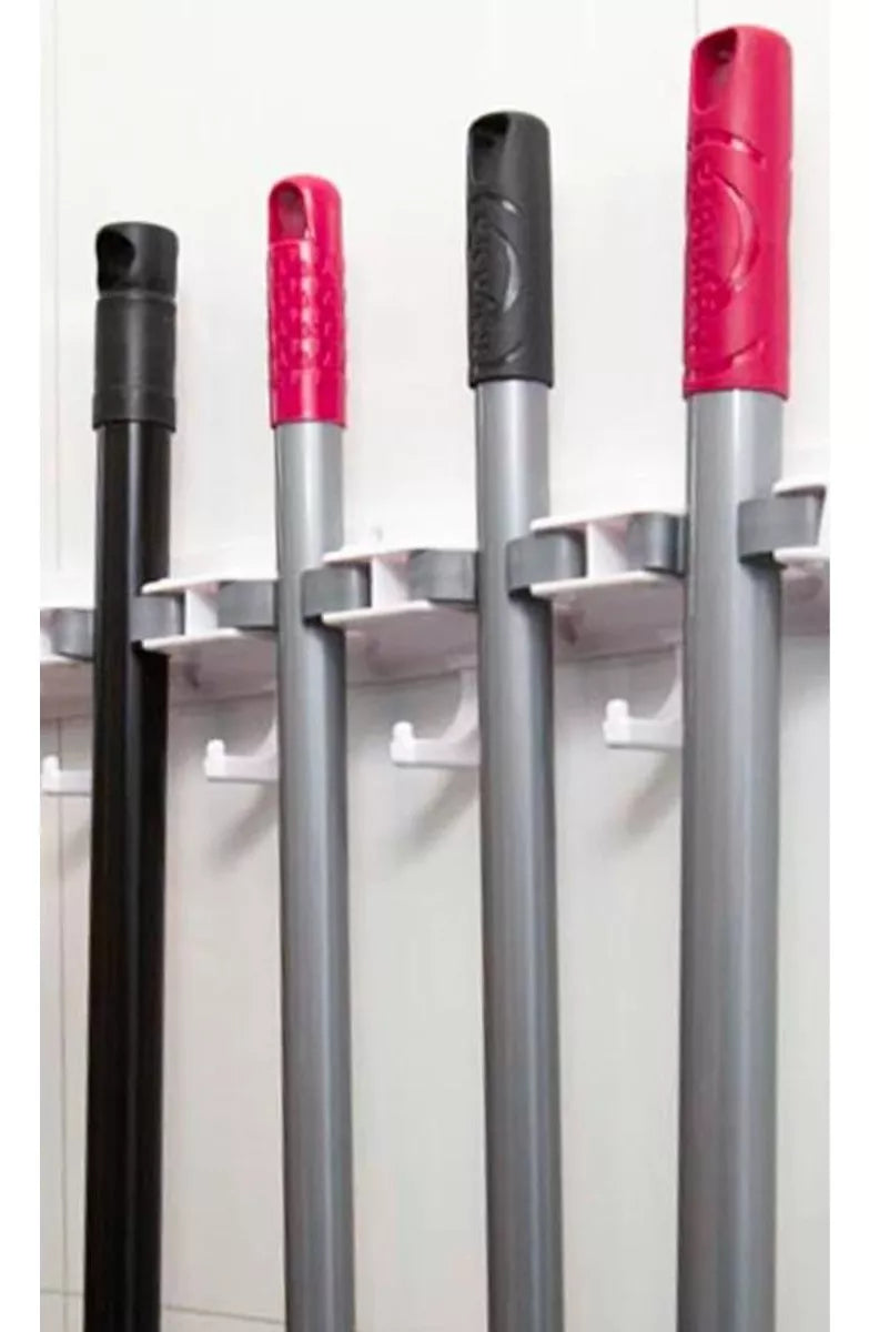 -5 espacios para colgar escobas, mops o recogedores. -4 ganchos para colocar telas limpiadores o cepillos. -Incluye material para hacer la fijación de este en la pared. -Elaborado con plástico resistente y de gran calidad.