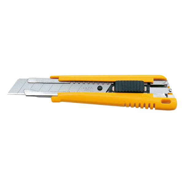 El Cutter Olfa EXL es una herramienta robusta y confiable para uso industrial y profesional. Su hoja de 18 mm de ancho permite realizar cortes firmes y eficientes en materiales de alta resistencia como cartón grueso, alfombras, plásticos, vinilo y madera ligera.