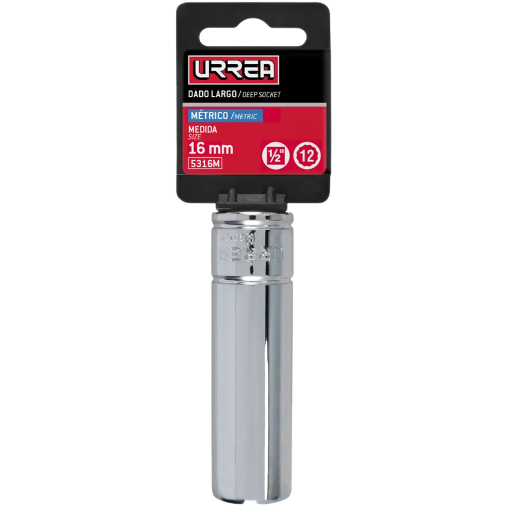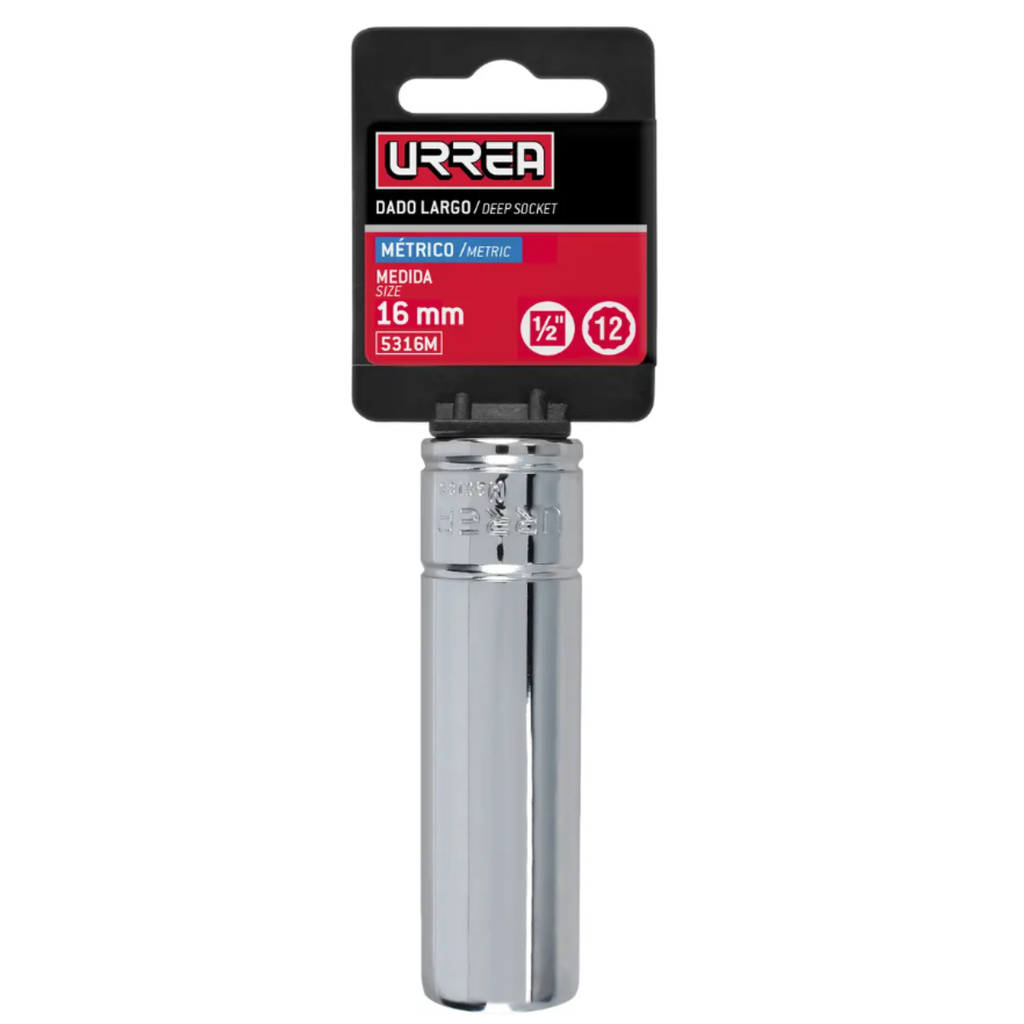 El dado largo cuadro de 1/2”, 12 puntas, métrico de 16 mm es un accesorio para herramientas de mano diseñado para apretar y aflojar tuercas y pernos hexagonales de medida métrica. Su diseño largo permite alcanzar sujetadores ubicados en zonas profundas o de difícil acceso, siendo ideal para trabajos de mecánica automotriz, mantenimiento industrial y uso general.