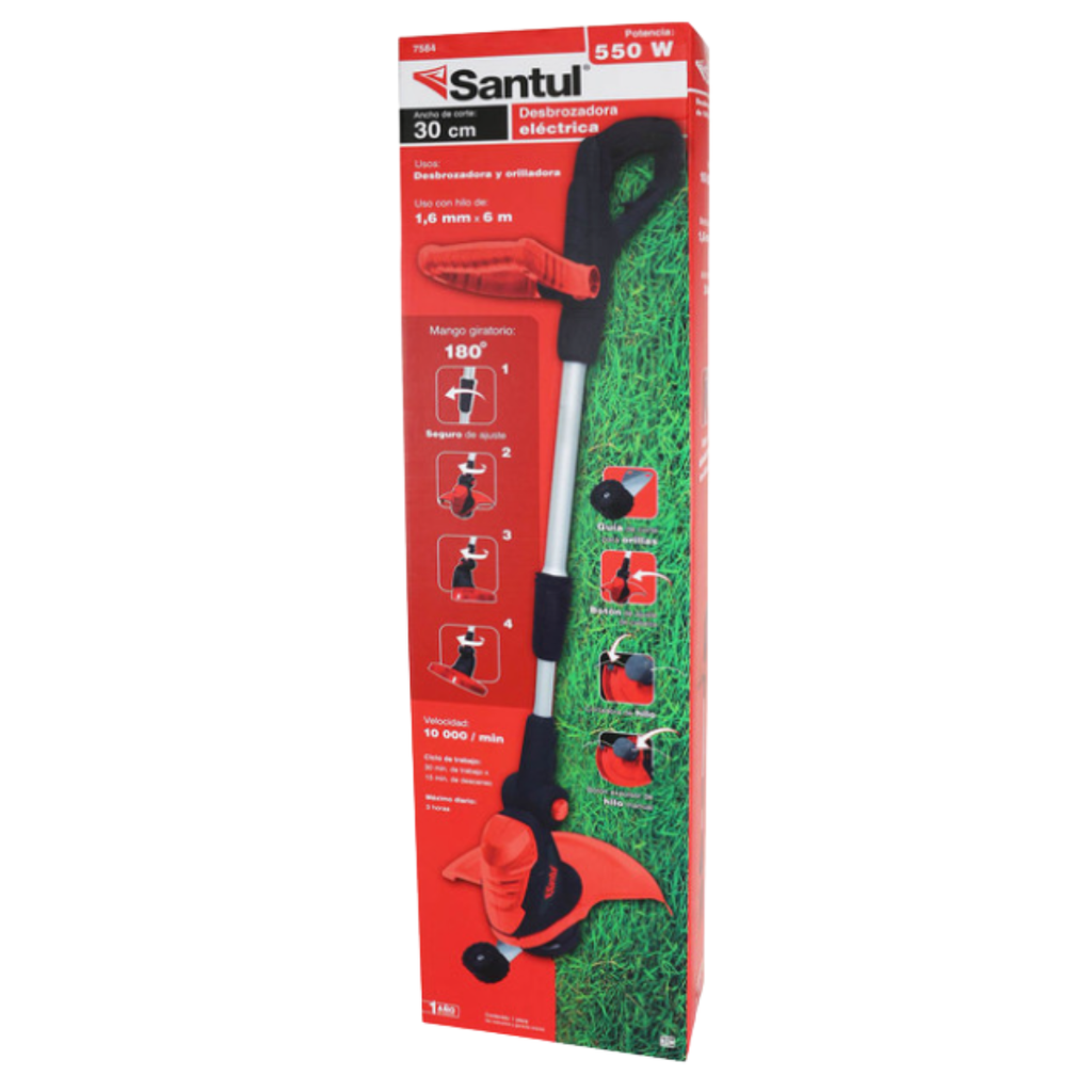 La desbrozadora eléctrica Santul 7584 es una herramienta pensada para cortar pasto, hierba y maleza ligera en jardines o áreas pequeñas. Sirve tanto como desbrozadora como orilladora gracias a su diseño, lo que facilita limpiar bordes, esquinas, orillas de jardín, o zonas difíciles de acceder con cortacésped. Tiene mango ajustable, mango auxiliar de soporte, y rueda guía para uso como orilladora. Su diseño permite un uso doméstico/residencial, ideal para mantenimiento de jardines