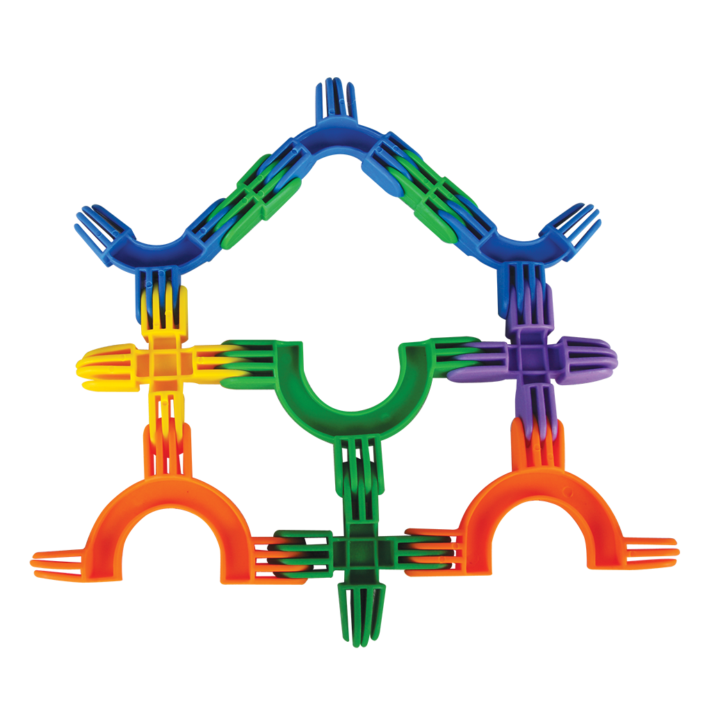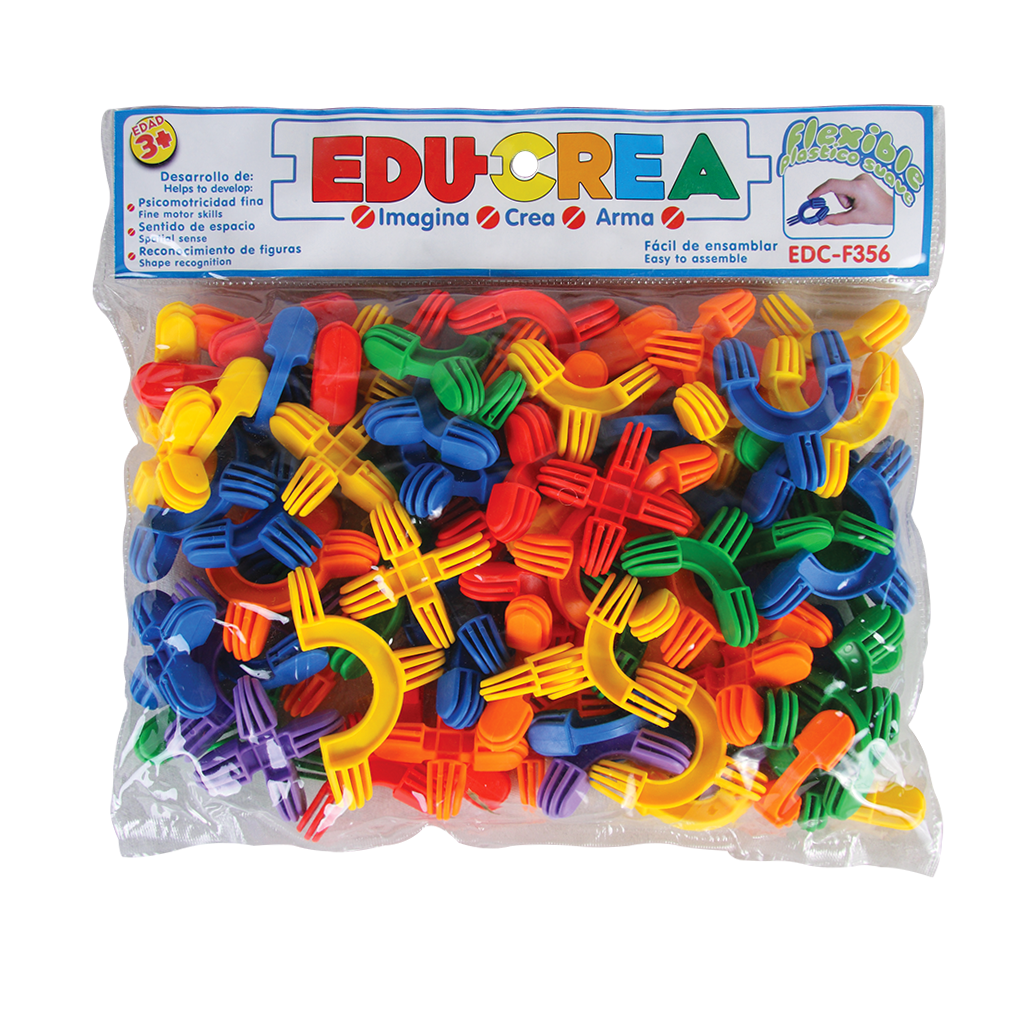 Juego de ensamble con piezas de plástico flexible que se unen entre sí para crear distintas formas. Crea los diseños que tu imaginación te permita. Desarrolla las habilidades estratégicas, la coordinación ojo-mano, la psicomotricidad fina y la imaginación.