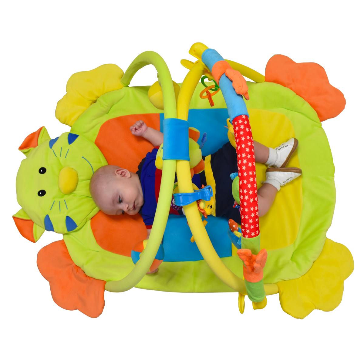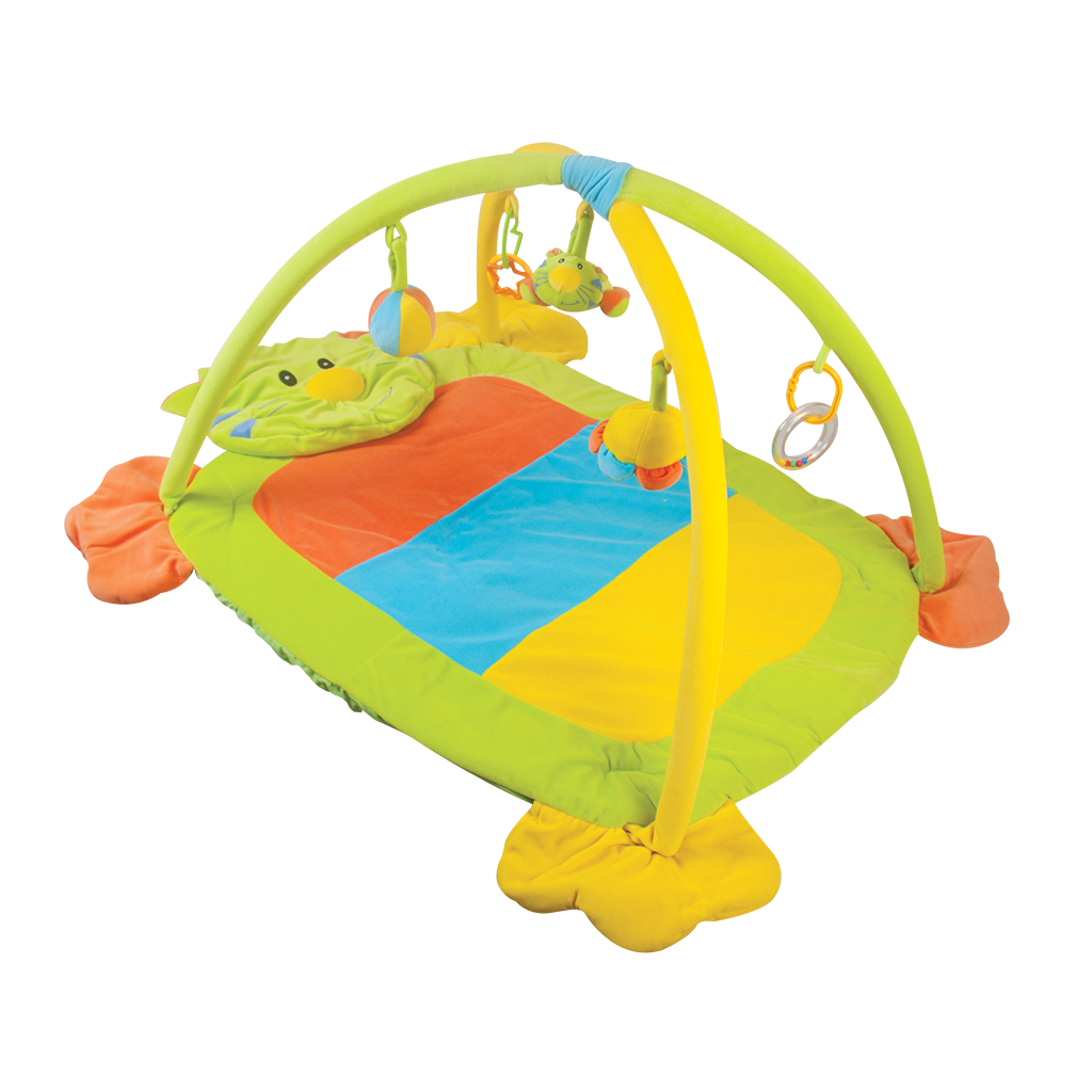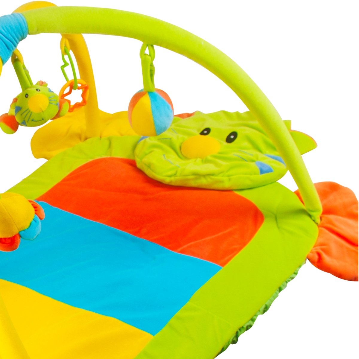 Gimnasio de tela para bebé colorido y divertido. Cuenta con 5 sonajas y un tapete con la cara de un tigre que estimulan el desarrollo psicomotriz, visual y auditivo, así como también fomenta el desarrollo del aparato locomotor del bebé.
