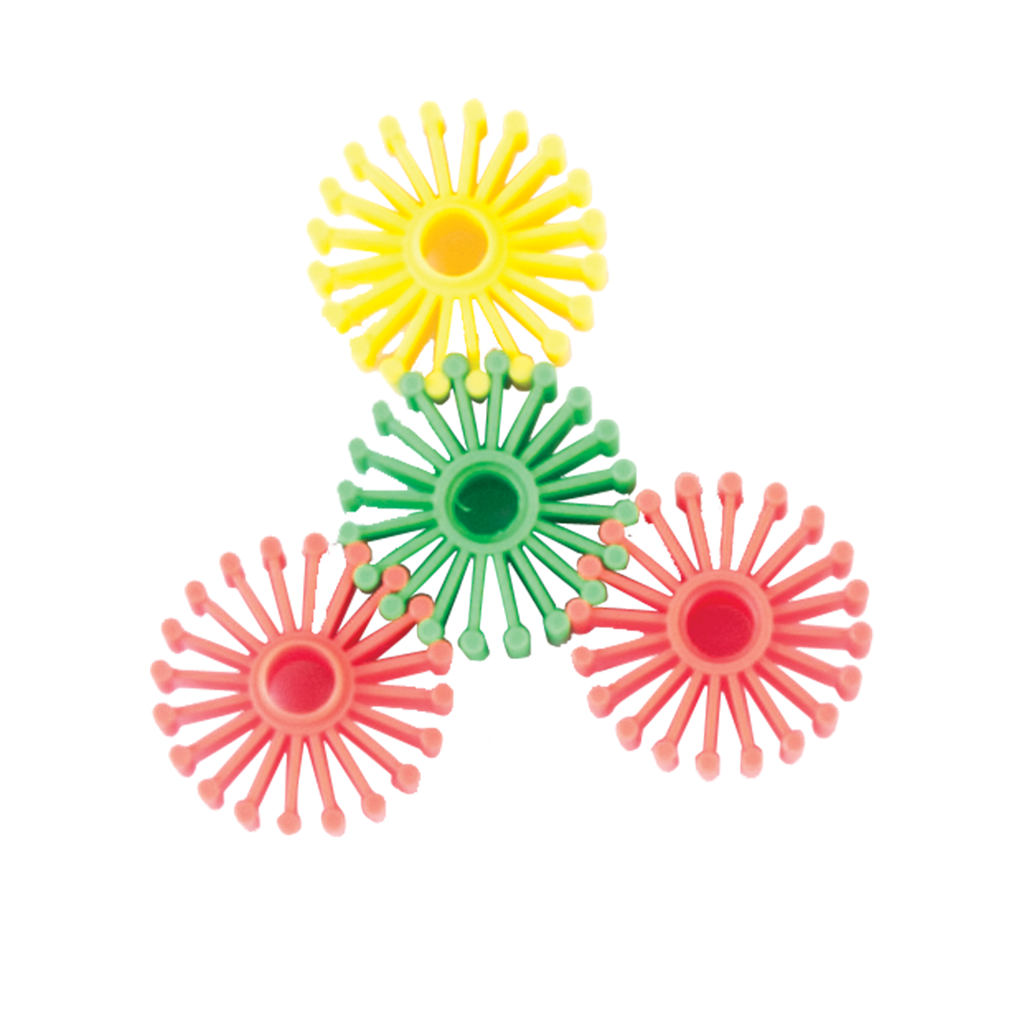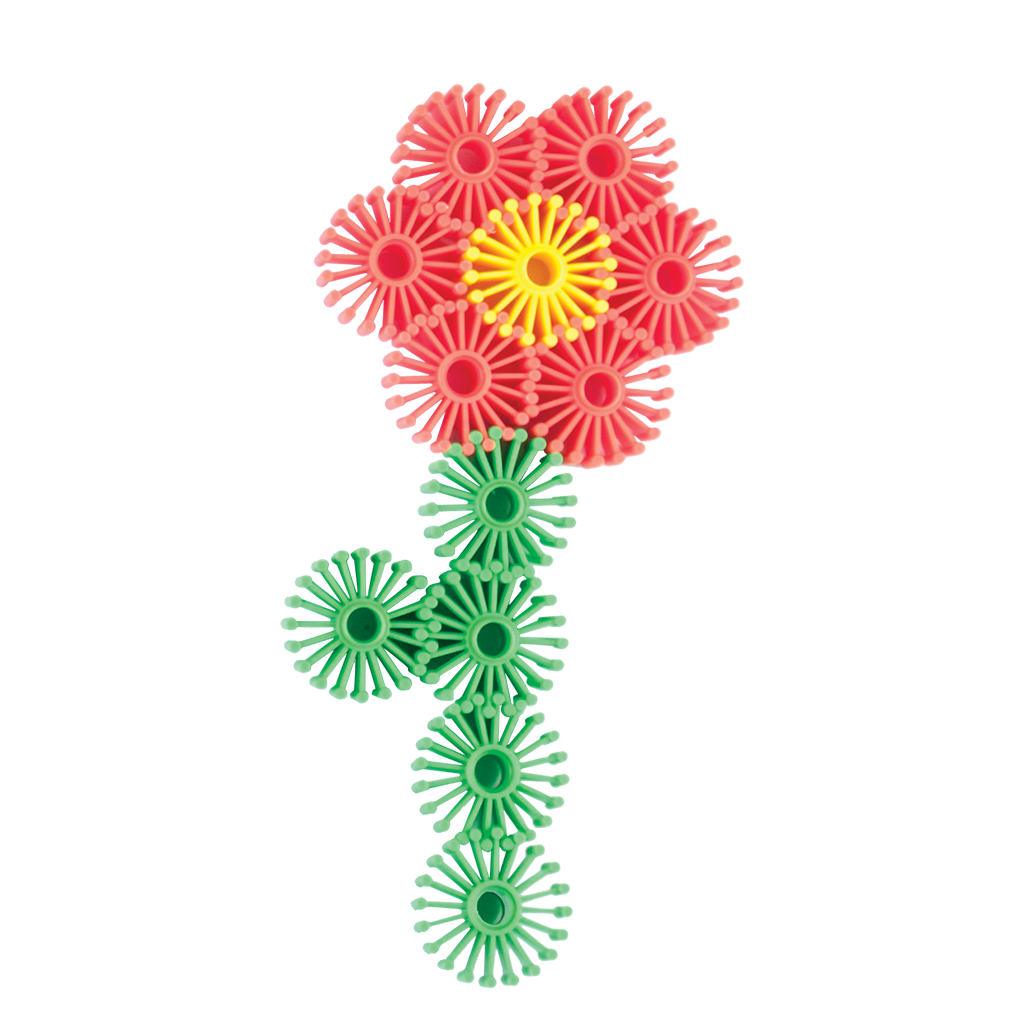 Juego de ensamble con piezas de plástico rígido que se unen entre sí con un "clic" para formar distintas figuras.