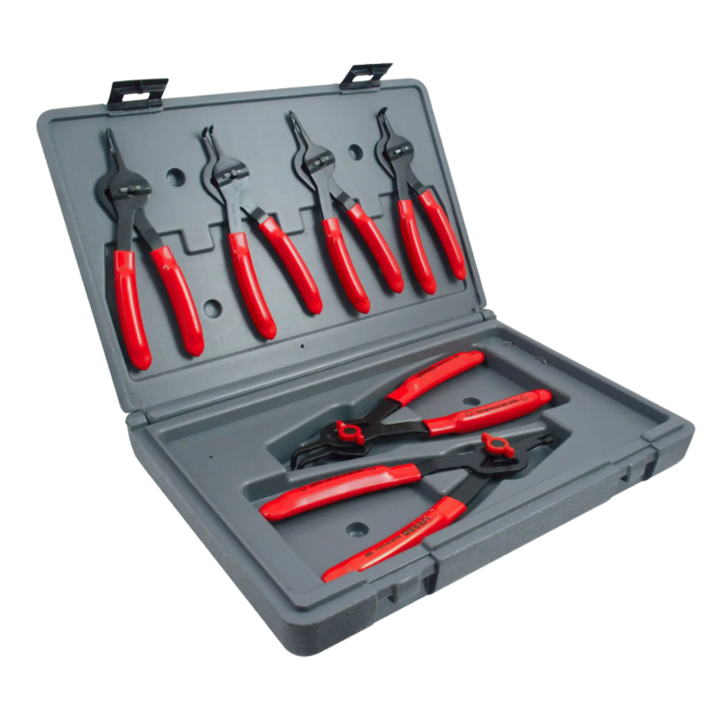 Juego de pinzas para anillos de retención convertibles con sistema tipo mariposa, compuesto por 6 piezas. Diseñado para instalar y retirar anillos de retención internos y externos de forma segura y eficiente. Su diseño convertible permite adaptar las pinzas a diferentes configuraciones de trabajo, ofreciendo versatilidad y precisión en aplicaciones mecánicas, automotrices e industriales. Incluye estuche para fácil organización y transporte.