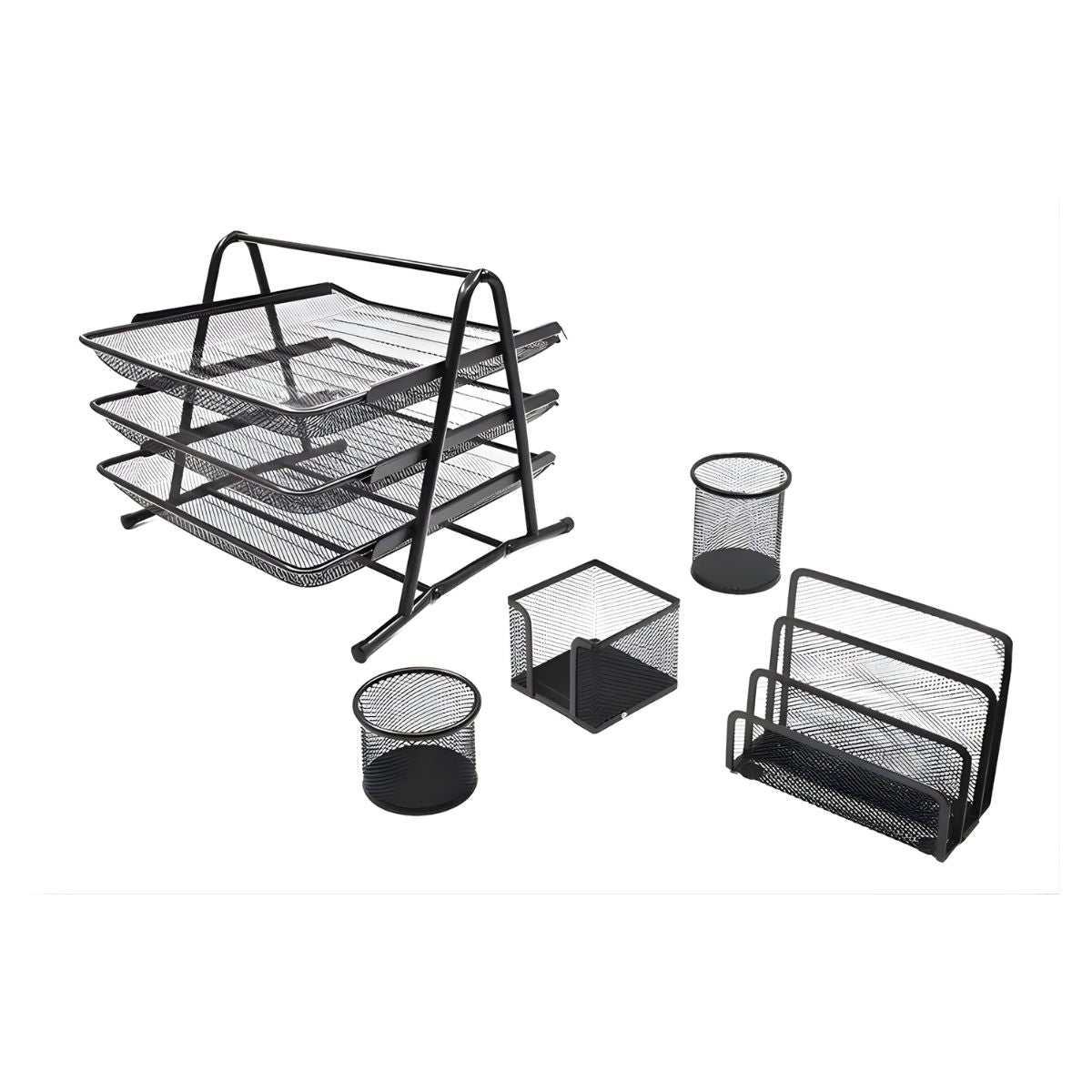 Contiene: 1 charola de 3 niveles, 1 organizador de sobres, 1 porta clips, 1 porta lápices y caja para notas adhesivas.