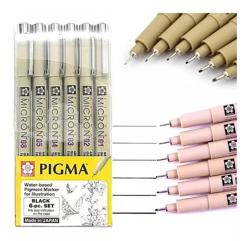 Kit con 6 estilógrafos pigma micrón que incluye: 01, 02, 03, 04, 05 y 08.