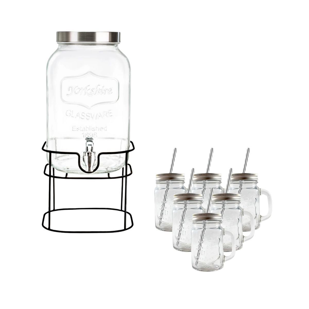Kit Vitrolero 5 lt + 6 Tarros Mason Jar Asa Tapa Plata