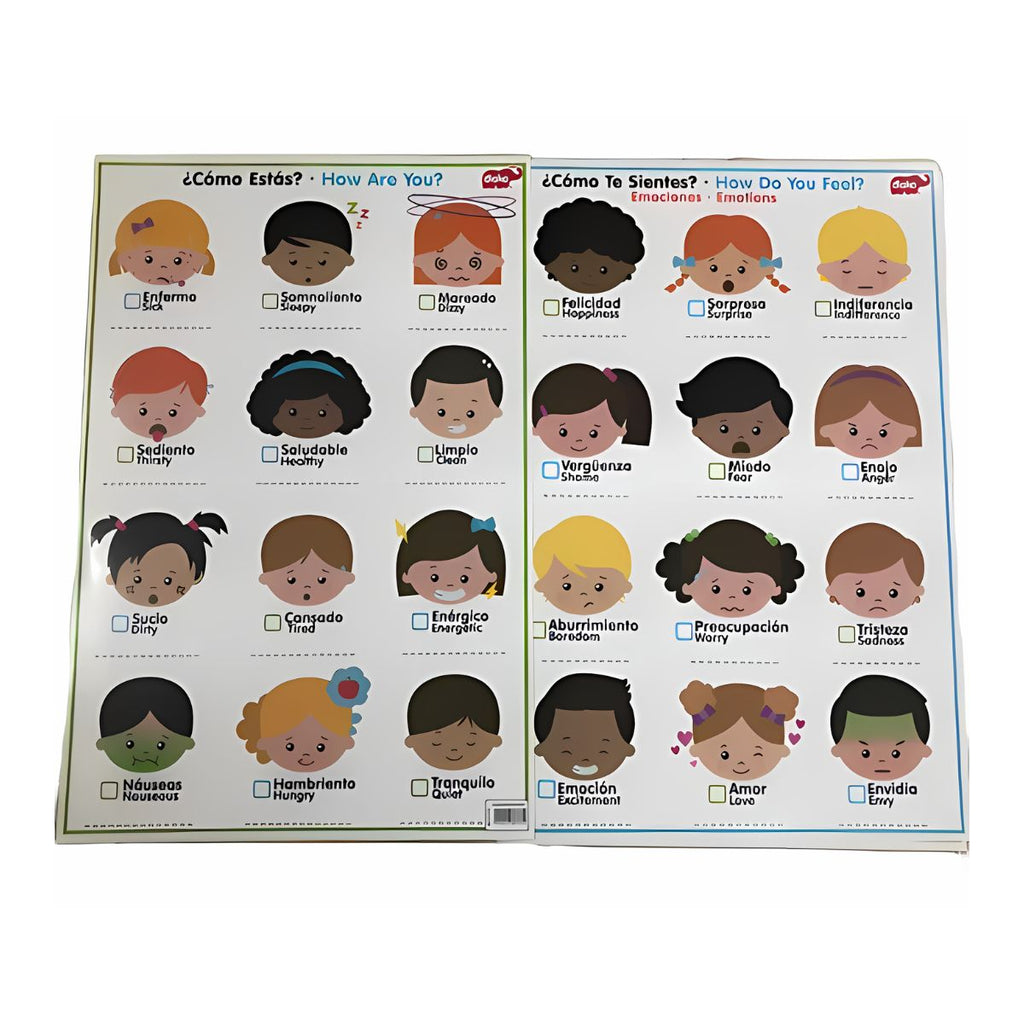 Gracias a su superficie plastificada, se puede escribir sobre ella con marcadores para pintarrón y borrar fácilmente con una tela húmeda, lo que permite reutilizarla todas las veces que sea necesario. Perfecta para usar en casa, en el aula o en sesiones de apoyo emocional.