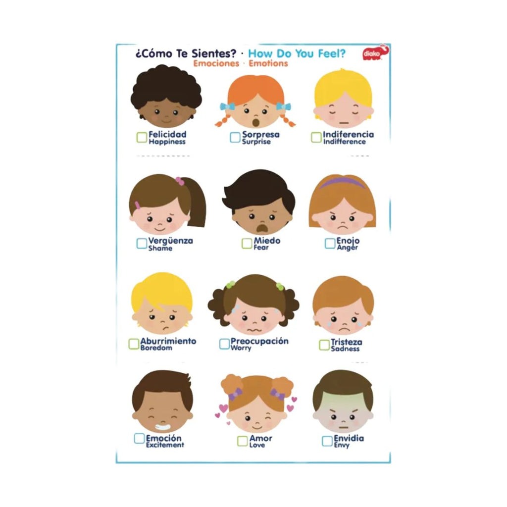 La Lámina de Emociones Diako es un recurso didáctico ideal para trabajar la identificación y expresión de sentimientos. Está plastificada e impresa por ambos lados: en una cara muestra diferentes emociones y en la otra, estados de ánimo, lo que la convierte en una herramienta versátil para actividades educativas y dinámicas de reflexión.