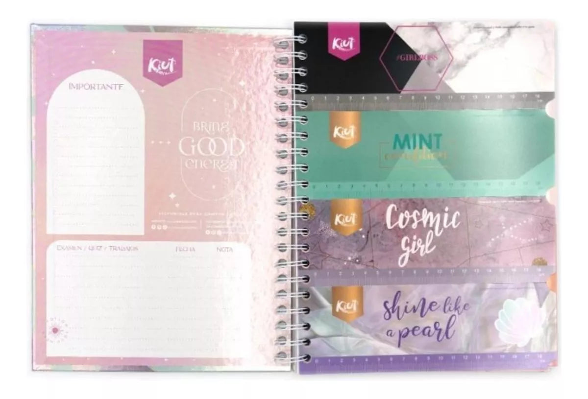Cuaderno tamaño profesional con doble arillo que incluye 160 hojas para 5 materias de 56 gr con sutil decorado en formato de raya. Con bolsillo de papel para guardar tus documentos importantes y una hoja de stickers para decorar tus notas, cuadernos y accesorios.