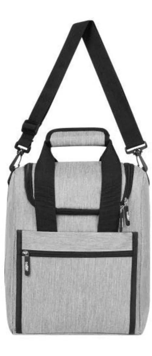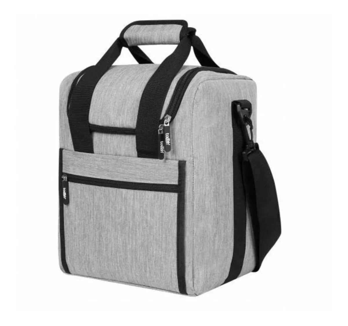 Interior metalizado plastificado. Bolsa frontal con cierre, asas y correa ajustable.