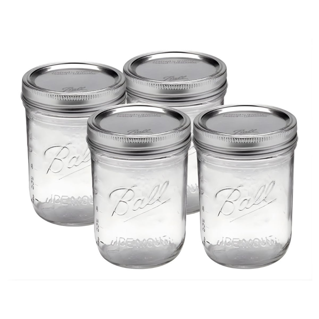 4 pz Frascos Mason Jars Ball 16oz/473ml Boca Ancha (Incluye tapa de 2 tiempos)