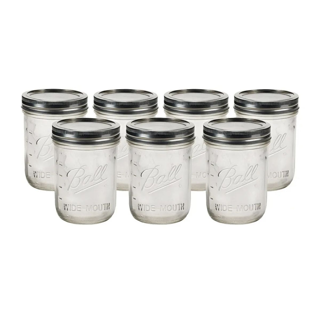 8 pz Frascos Mason Jars Ball 16oz/473ml Boca Ancha (Incluye tapa de 2 tiempos)