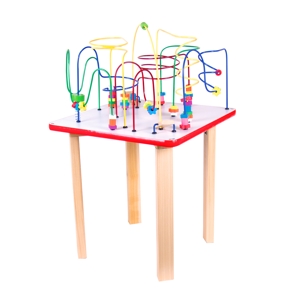 Mesa con cubierta de melamina y patas de madera , con 9 laberintos de diferentes formas, tamaños y colores. *El producto viene desarmado.