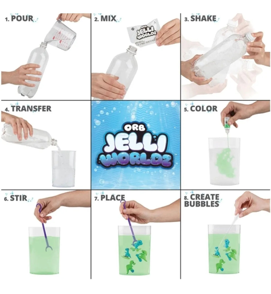 ¡Crea tus Mundos Jelli en animación suspendida! Llena tu recipiente de Jelli Worlds con agua y polvo de Jellifetti, ¡luego míralo mágicamente como Jellify! Coloque sus figuras coleccionables en su contenedor Jelli Worlds con cualquier otra cosa que desee para crear un entorno de juego super único.
