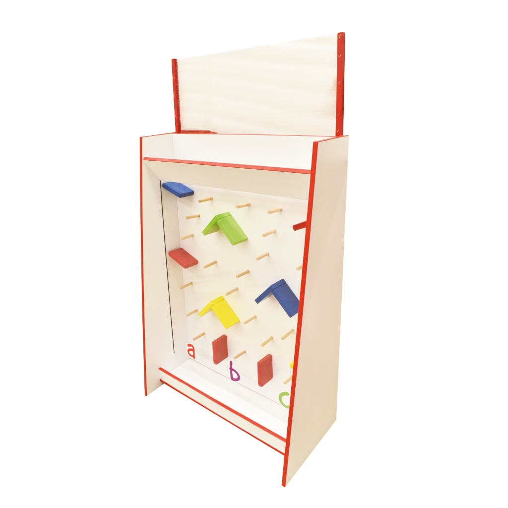 Pared Didáctica que consiste en lanzar las pelotas de plástico y lograr que caigan en la sección A, B o C. Permite el desarrollo de la psicomotricidad gruesa, el aprendizaje de colores y la convivencia social. Las paredes didácticas son de gran entretenimiento para los niños y actualmente son la última tendencia en espacios infantiles, haciendo posible que la decoración y el aprendizaje sean entretenidos y divertidos.