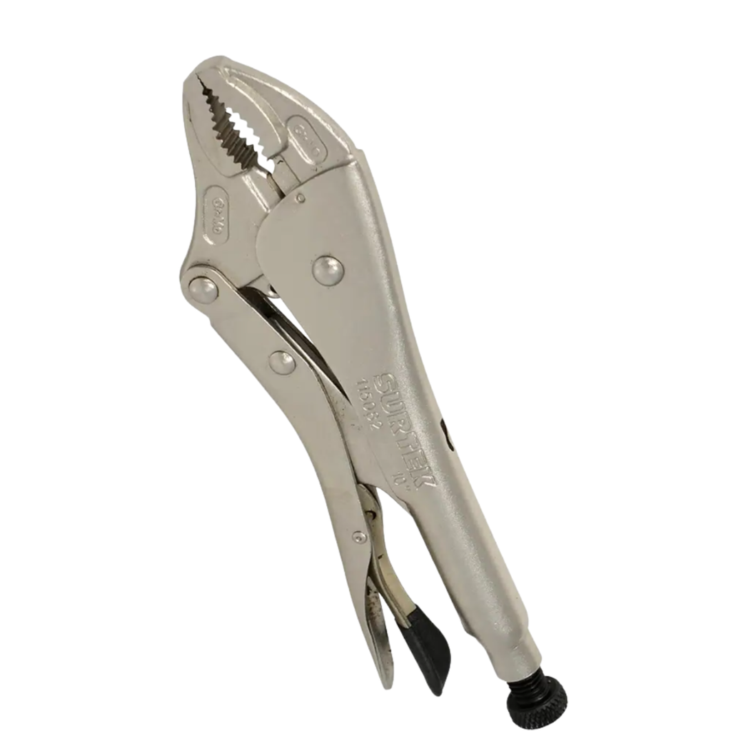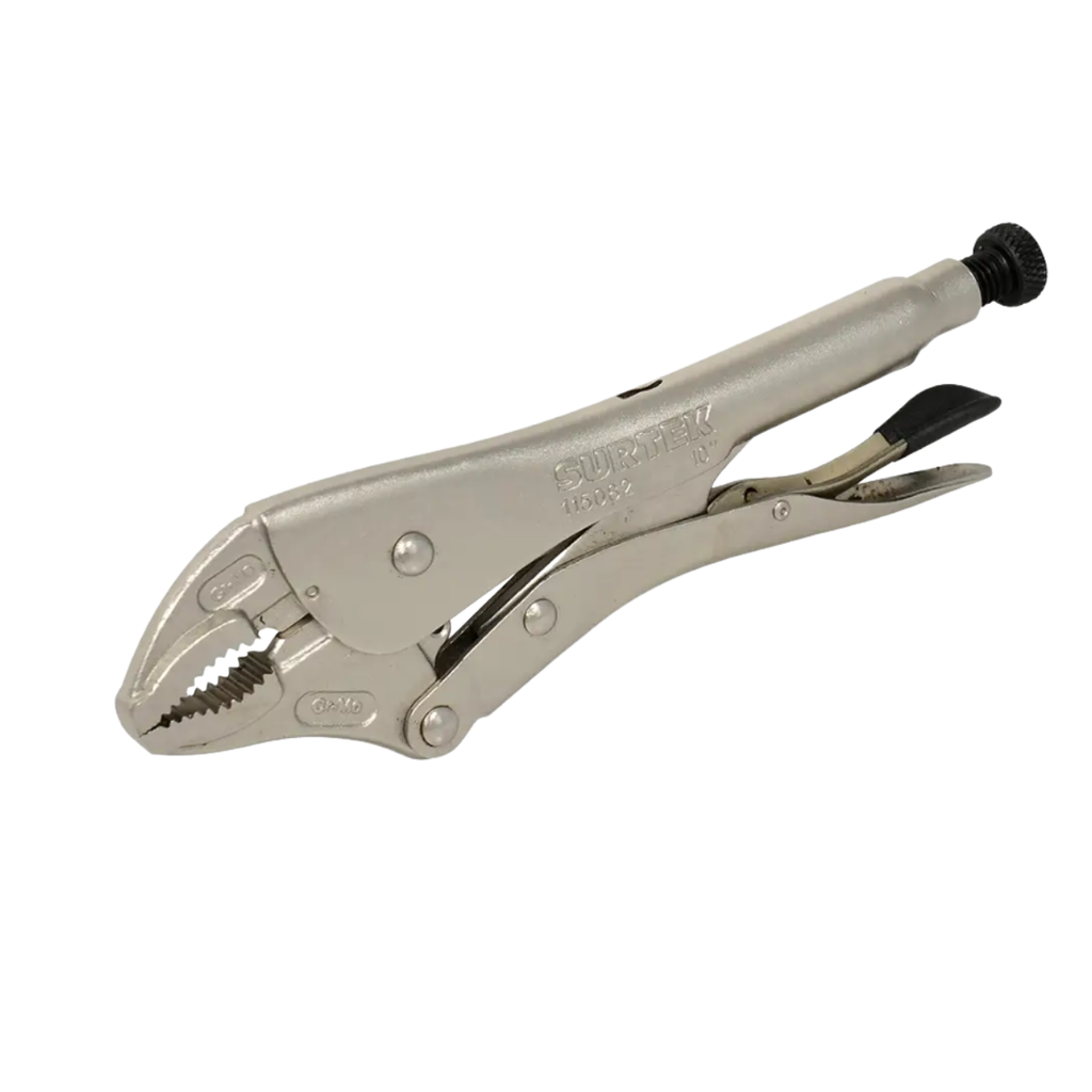La pinza de presión de 10 pulgadas con quijada curva es una herramienta manual diseñada para sujetar firmemente piezas, tornillos, tuercas, tubos u otros objetos mientras se trabaja. La quijada curva permite un mejor agarre en superficies redondas, hexagonales o irregulares. Se utiliza en mecánica, metalurgia, construcción y mantenimiento para sostener, apretar o mantener piezas sin necesidad de mantener la presión con la mano.