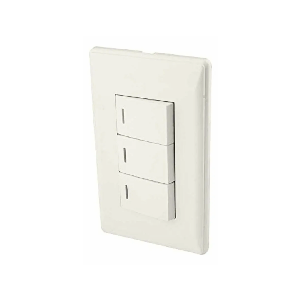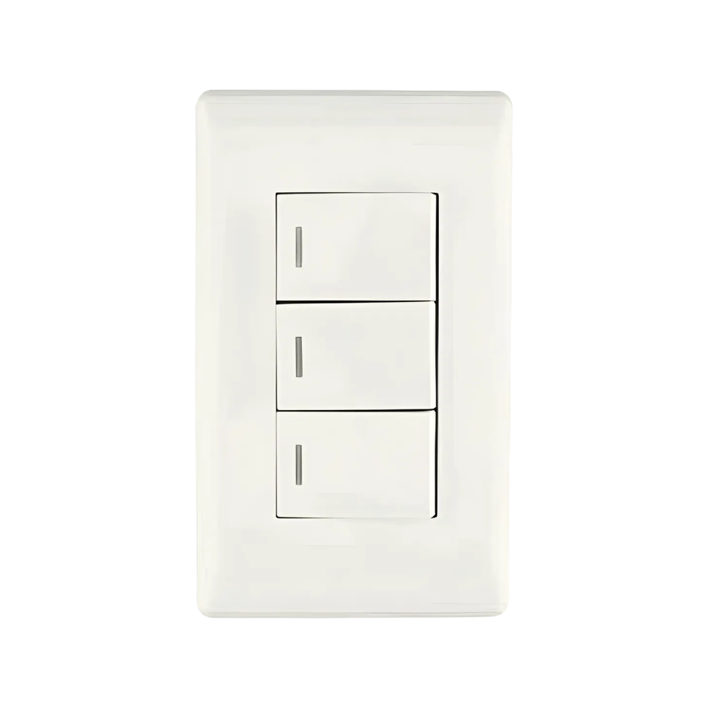 Fabricada en plástico de alta resistencia, garantiza durabilidad frente al uso cotidiano y protección contra desgaste. El sistema de triple apagador permite manejar tres fuentes de luz de manera independiente, brindando comodidad y eficiencia en el control eléctrico.
