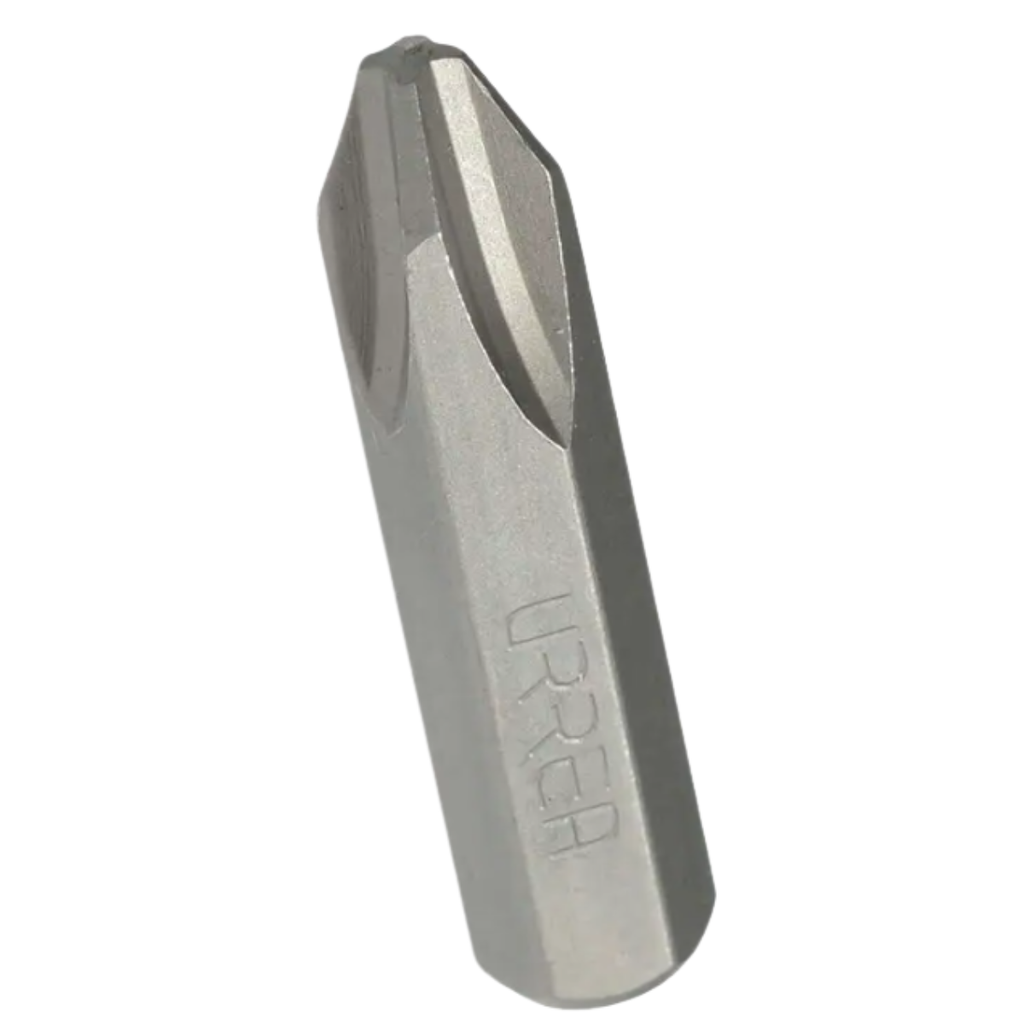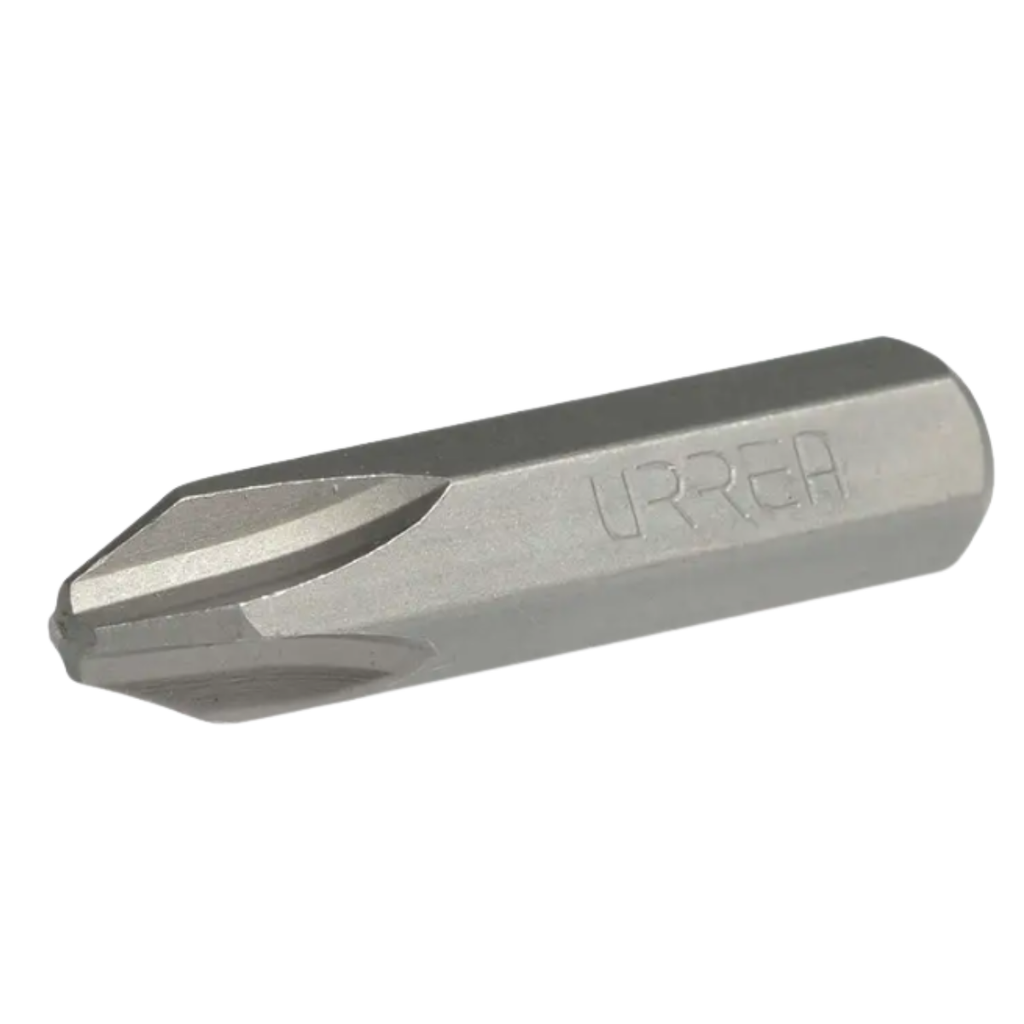 Punta intercambiable de la marca Urrea diseñada para atornillar o desatornillar tornillos con cabeza Phillips grandes. Tiene un vástago hexagonal de 5/16 pulgadas, lo que permite un acople firme en porta puntas, adaptadores o destornilladores manuales con entrada hex. La punta es de tipo Phillips #3, adecuada para tornillos de mayor tamaño que requieren mayor torque y un buen agarre. Está construida para ofrecer resistencia al desgaste y una vida útil prolongada en tareas generales de uso profesional o doméstico.