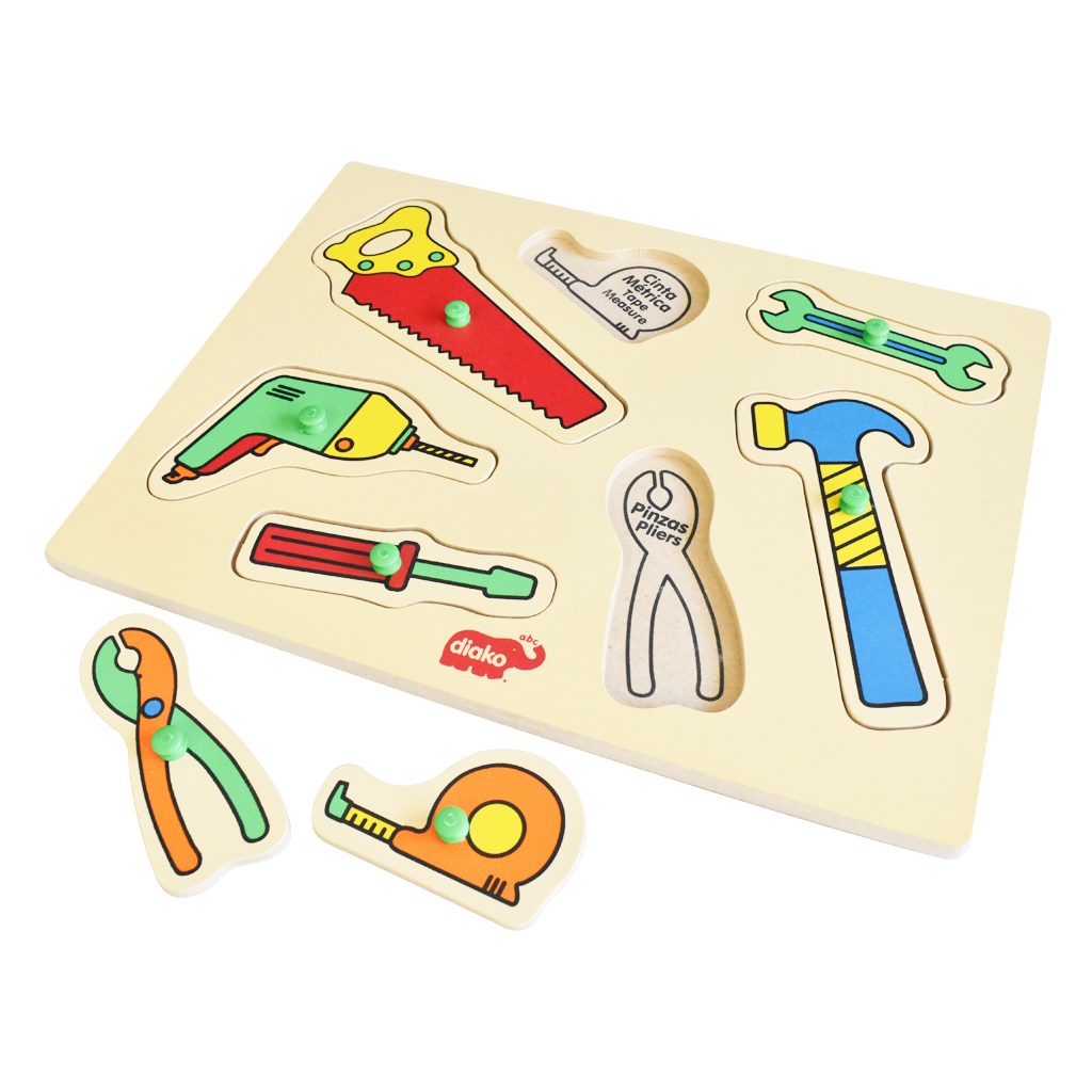 Resaque de madera con figuras de herramientas que estimula psicomotricidad fina y asociación, la concentración, el aprendizaje de colores, el desarrollo del vocabulario, entre otras. Encuentra el nombre de cada herramienta en inglés y en español debajo de cada pieza.