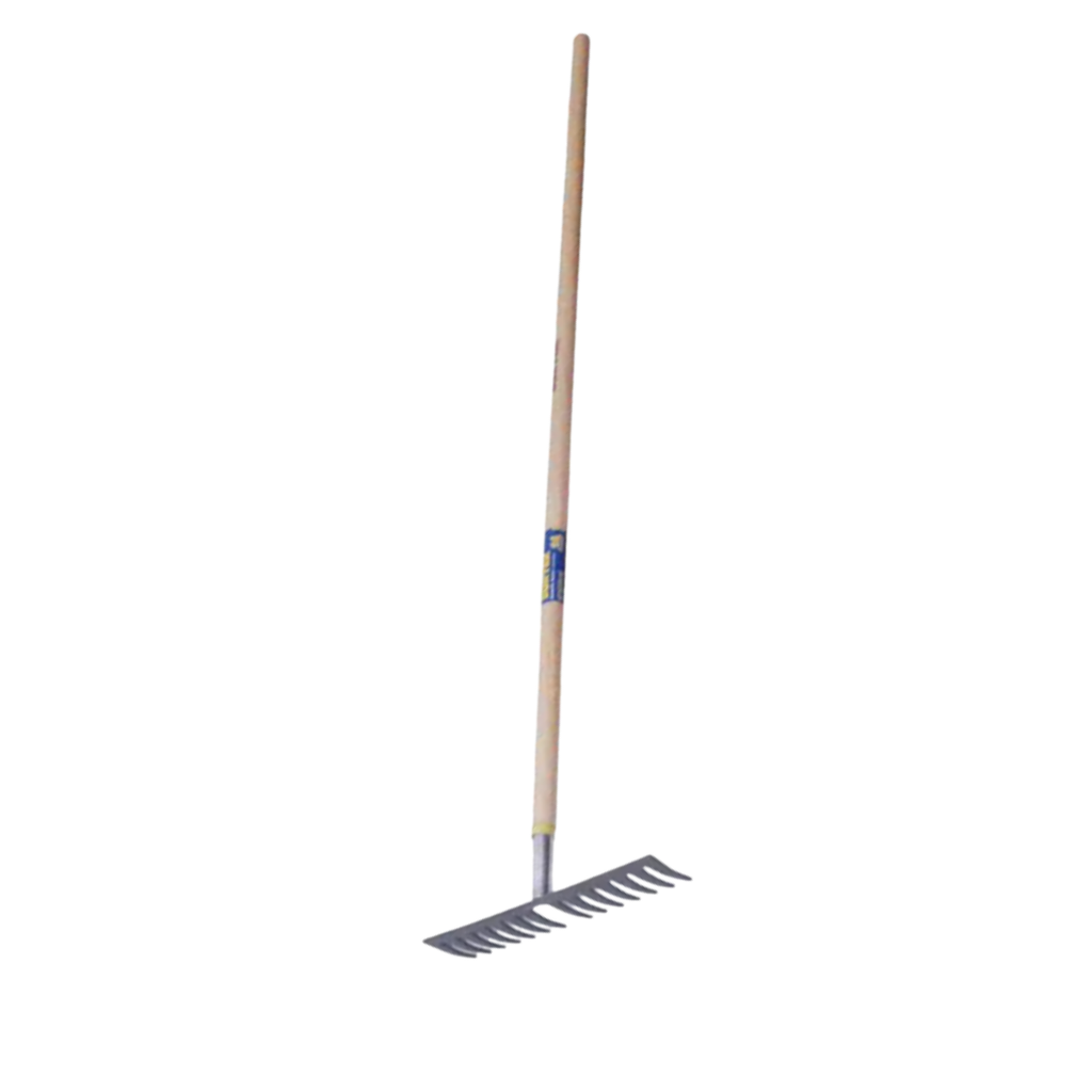 El rastrillo curvo para jardín con mango de madera, 60 cm y 14 dientes es una herramienta manual diseñada para nivelar, recoger hojas, pasto o residuos de jardín y preparar la tierra para siembra o mantenimiento. Su mango de madera proporciona resistencia y comodidad, mientras que la cabeza curva con 14 dientes de metal permite un trabajo eficiente al arrastrar, alisar o recolectar materiales sueltos sin dañar el suelo.