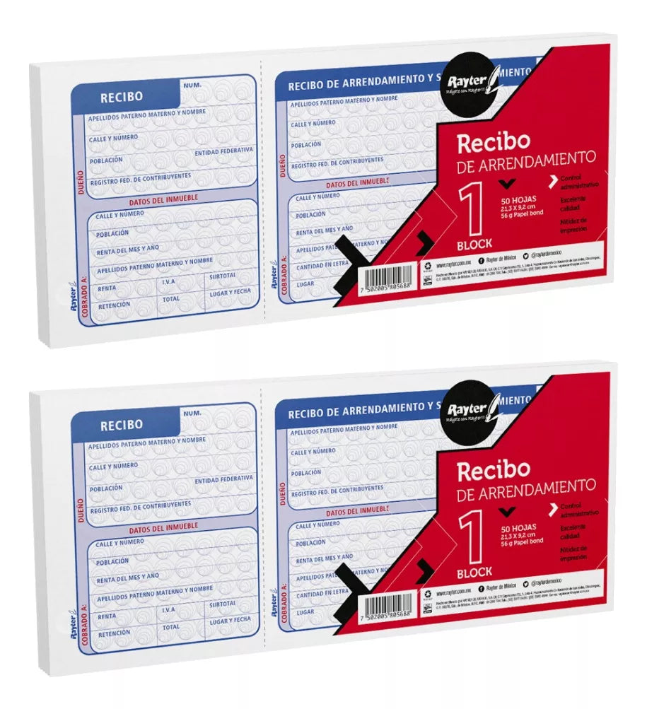 Blister con 2 Block Recibo de Arrendamiento 50 Hojas cada uno 1/3 Carta RAYTER