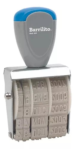 Este sello fechador de la marca Barrilito utiliza una tipografía de cinco milímetros para marcar fechas en documentos de manera clara y legible. Es ideal para oficinas y entornos administrativos donde se requiere un registro preciso de las fechas. Su diseño facilita un uso cómodo y eficiente, garantizando una marcación uniforme y duradera.
