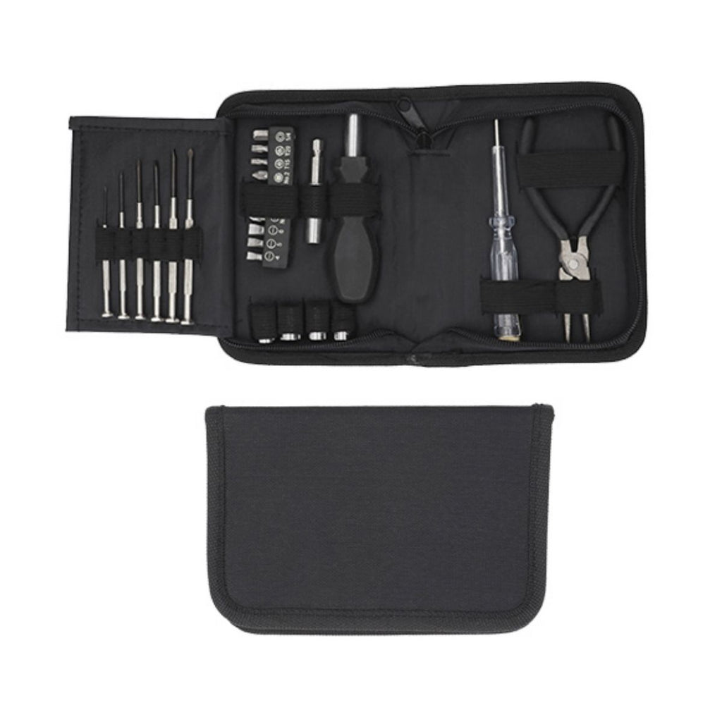 - Set de herramientas en estuche de poliéster que contiene 23 piezas: Desarmador plano con probador de corriente, pinzas de punta, 4 dados, 1 desarmador con extensión y adaptador para 9 puntas intercambiables y 6 desarmadores de precisión.