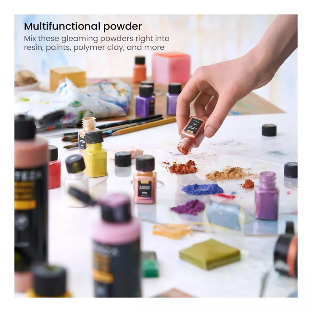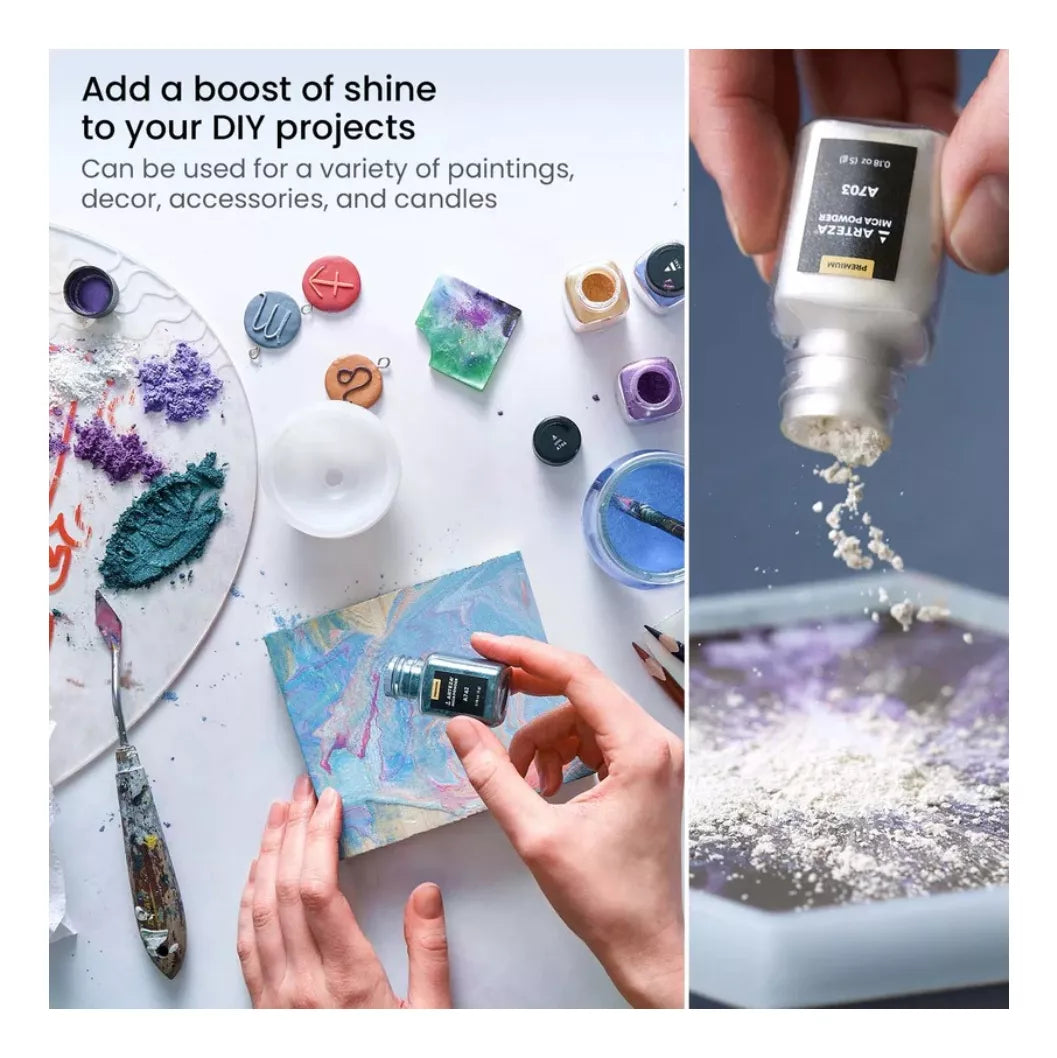 Nuestros Polvos de Mica se pueden usar para una variedad de pinturas, piezas de arte y manualidades. Los colores de nuestro Set de Polvos de Mica son tan vibrantes que puedes crear fácilmente efectos brillantes y fascinantes en una variedad de medios artísticos. Muchos clientes agregan algunas cucharadas de Polvos de Mica a sus pinturas para hacer pinturas cautivadoras que llamarán la atención de todos. Consigue un set hoy mismo y experimenta la belleza de los relucientes polvos de mica de Arteza.