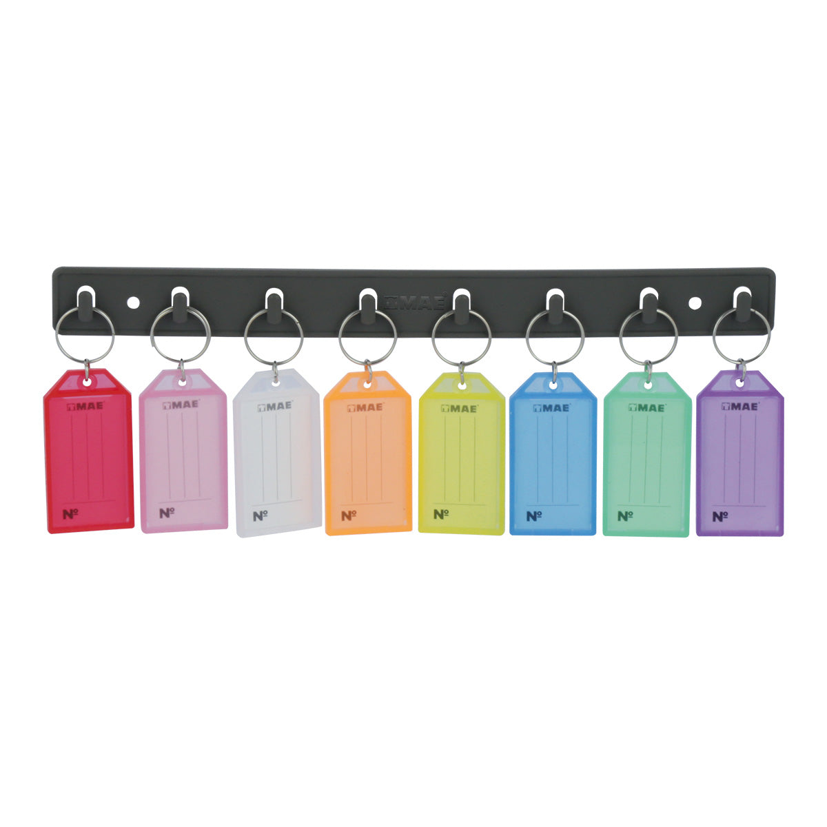 Mantén tus llaves organizadas y fácilmente identificables con el soporte MAE, diseñado para entornos escolares, domésticos o de oficina. Fabricado en polipropileno resistente, este organizador incluye 8 llaveros y 12 etiquetas de colores surtidos, ideales para clasificar por área, usuario o función