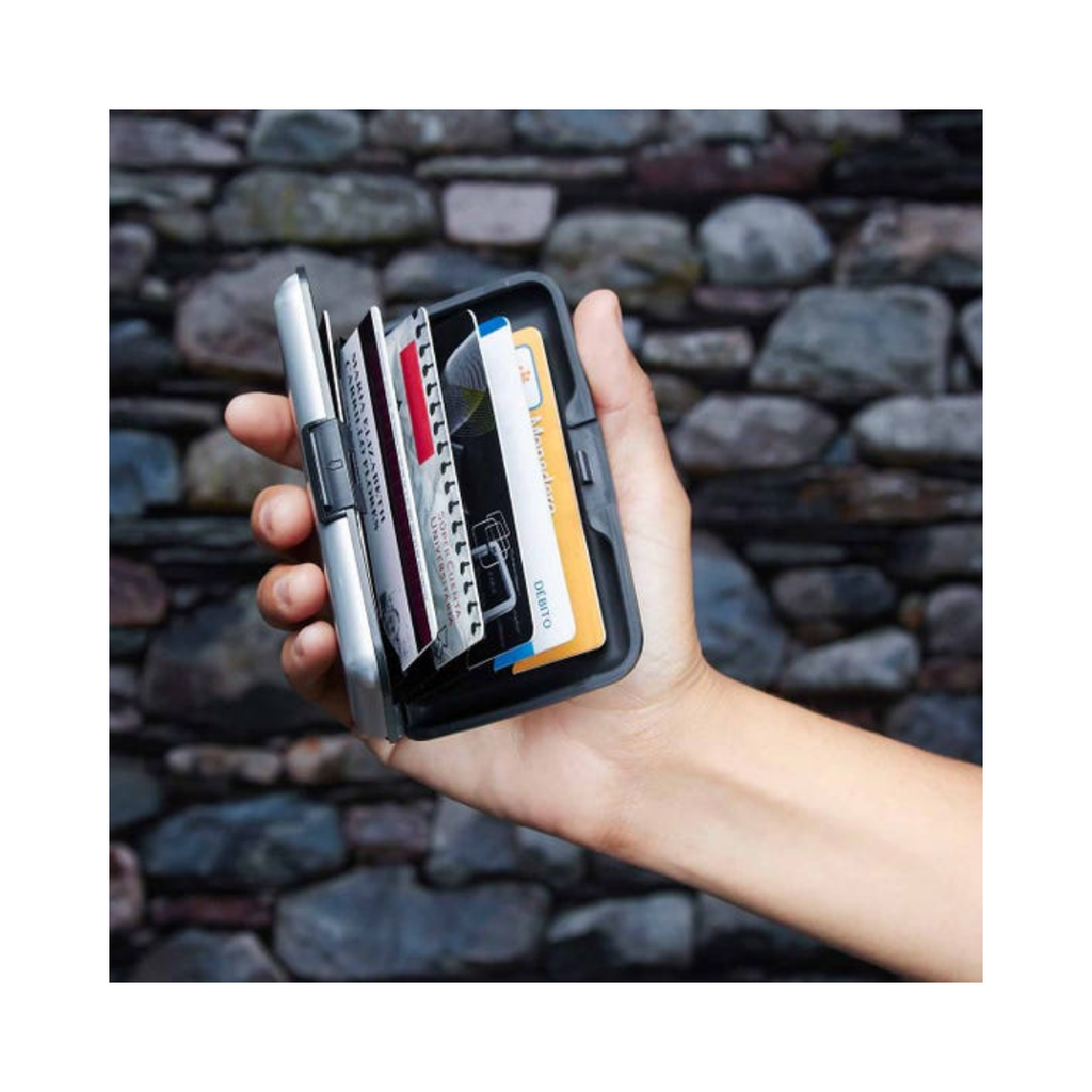 Con 6 espacios para tarjetas. Sistema anti robo RFID.
