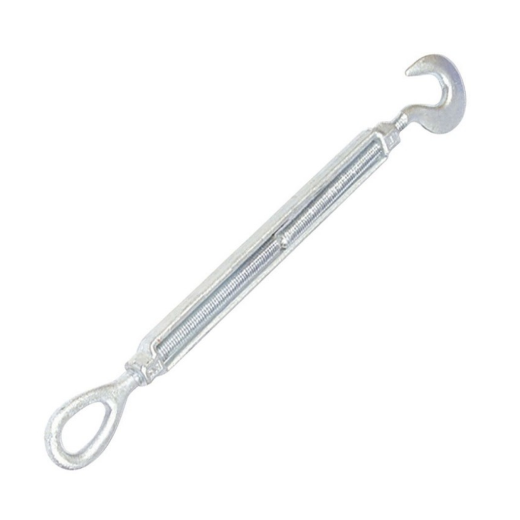Su diseño con gancho y argolla permite ajustes rápidos de tensión sin necesidad de herramientas adicionales complejas, facilitando instalaciones y ajustes en líneas tensadas o estructuras móviles.