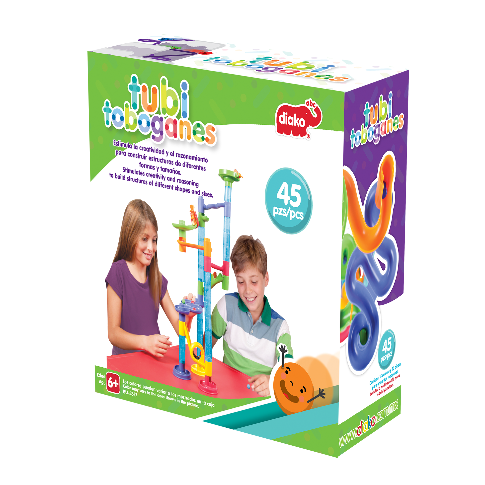 Tubitoboganes estimula la creatividad y el razonamiento para construir estructuras de diferentes formas y tamaños. Cuenta con piezas transparentes que permiten dar un seguimiento visual completo del curso de las canicas.
